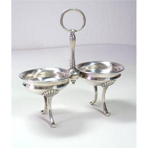 This elegant double open salt features two bowls with curved legs. The legs form delicate scallop motifs at the top. The bowls are connected by a bulbous handle with a loop at the top in a