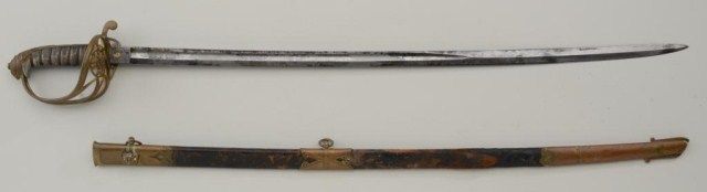 19th century British officer’s sword showing Victoria’s crest on guard by Henry Wilkinson, Pall Mall London with J.B.R. in fancy initials etched on blade with original matching and hallmarked scabbard; blade verygood, scabbard shows small loses and opening at seam; #5685 on rear of spine; good patina; some wear to grip; good overall. Est.: $300-$600.