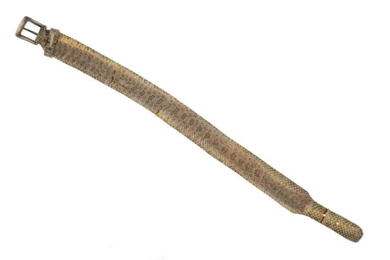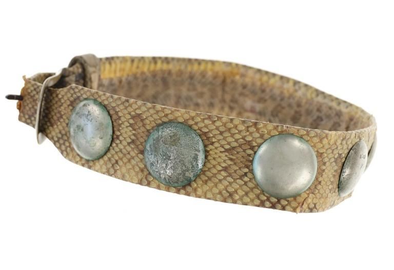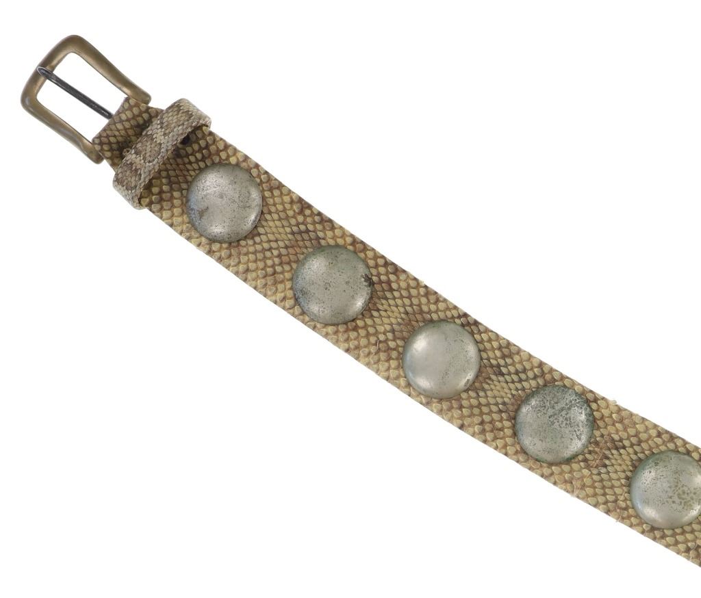 Provenance: The belt is from the ex- 2004-2005 Allard sale where it was found to be an authentic 19th-century Comanche example; and from a Northern Montana collection. The rattlesnake skin and belt have stiffened with the end of the belt where it connects to the buckle has a crack. Measures overall 39-inches long overall by 2 5/8-inches wide at the middle. Each concho is about 2-inches in diameter. Buckle is 3-inches by 2 3/8-inches.