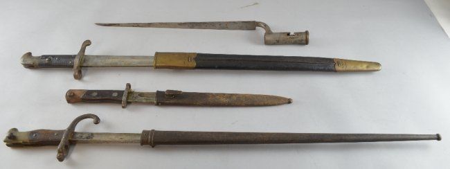 19th century French Chassepot bayonet with metal scabbard marked St Etienne Aug 1878, blade 23" and three other bayonets