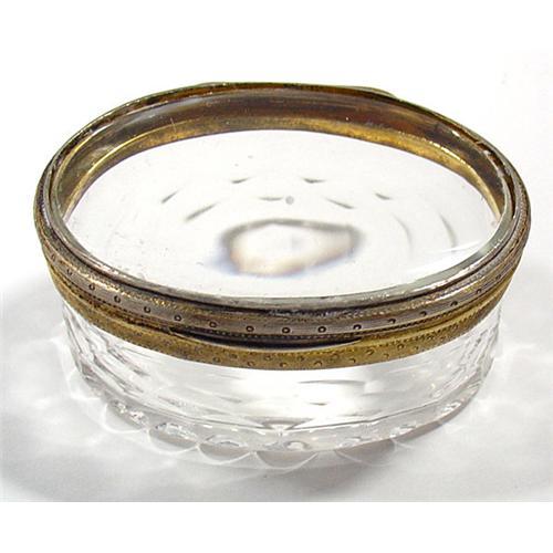 This small elegant cut rock crystal and rock crystal rouge pot or pill box features a honeycomb design on the sides with a plain top. The gilt-silver hinged frame displays stylized bands with decorative dots. It is in very good condition, with no chips. French hallmark appears on the rim.