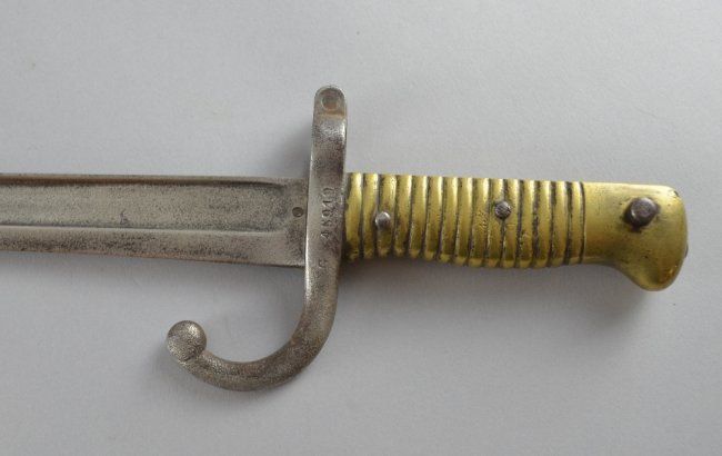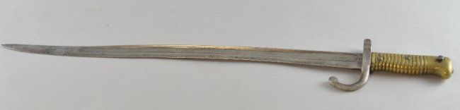 19th century French chassepot bayonet, with brass mount and curved fullered blade, stamped G45919