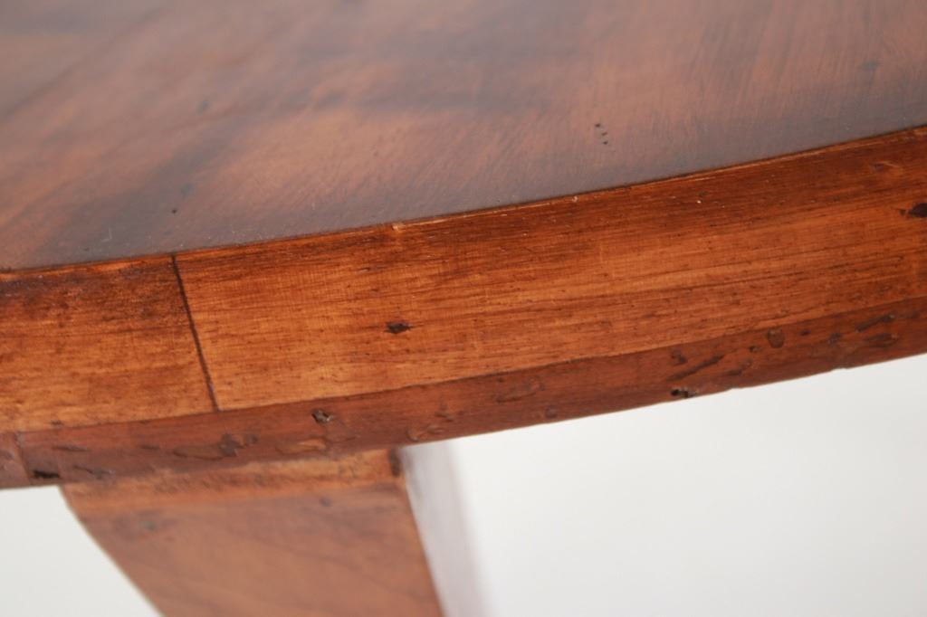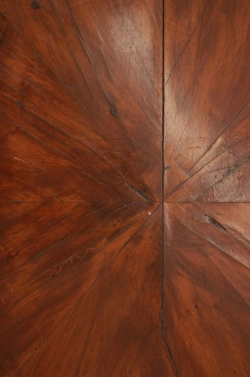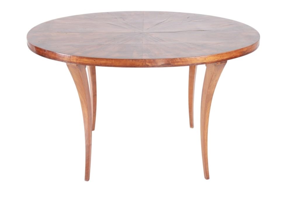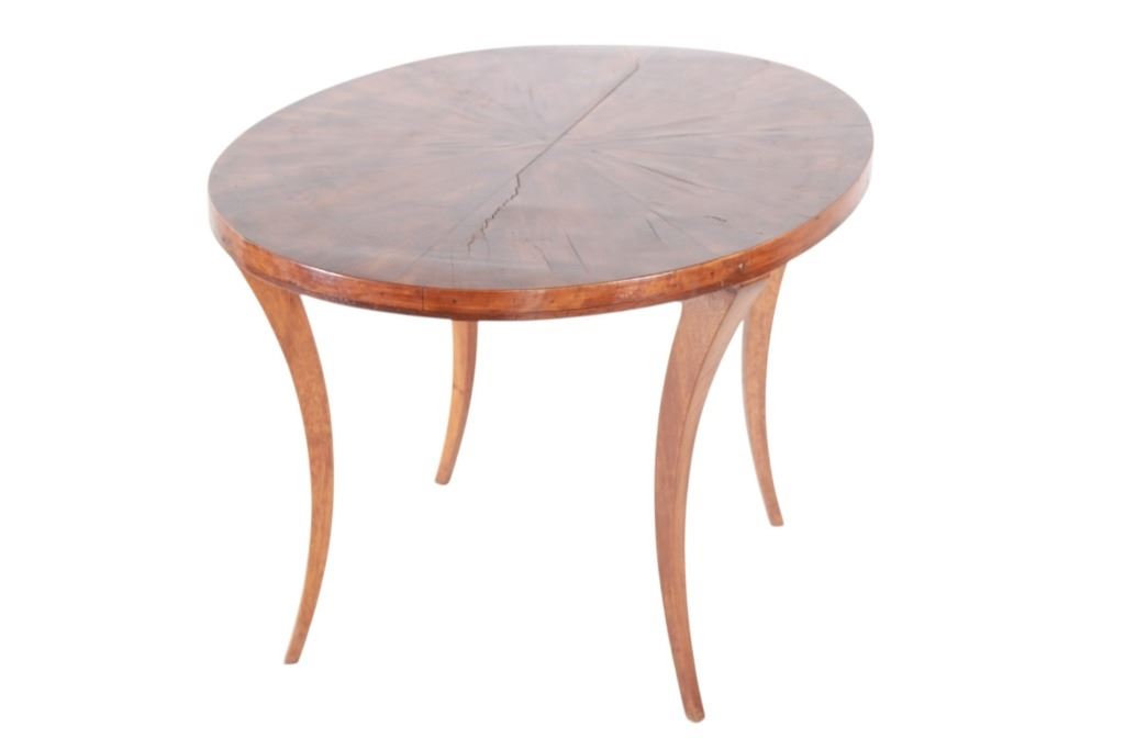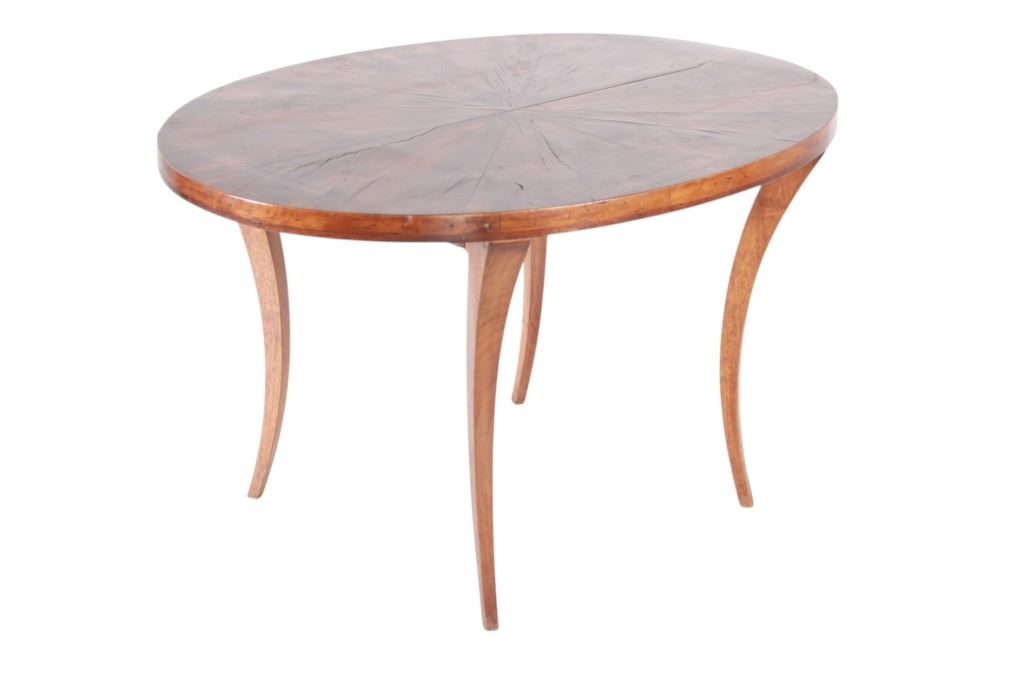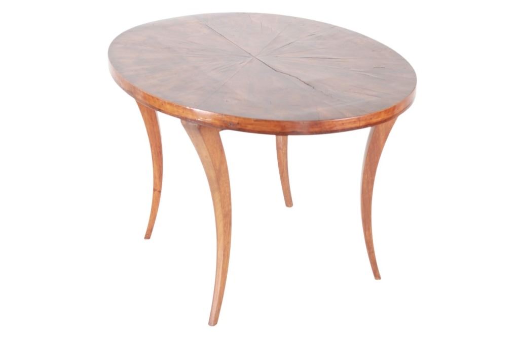 The lot features a beautiful parquetry walnut oval coffee table with sabre curved legs dating to the early 19th-century from Italy. This Italian table shows a sunburst parquetry oval top with sabre curved legs and was collected in Italy many years ago by the consignor. The piece is well kept and measures 23.5-inches by 39-inches by 28.25-inches.