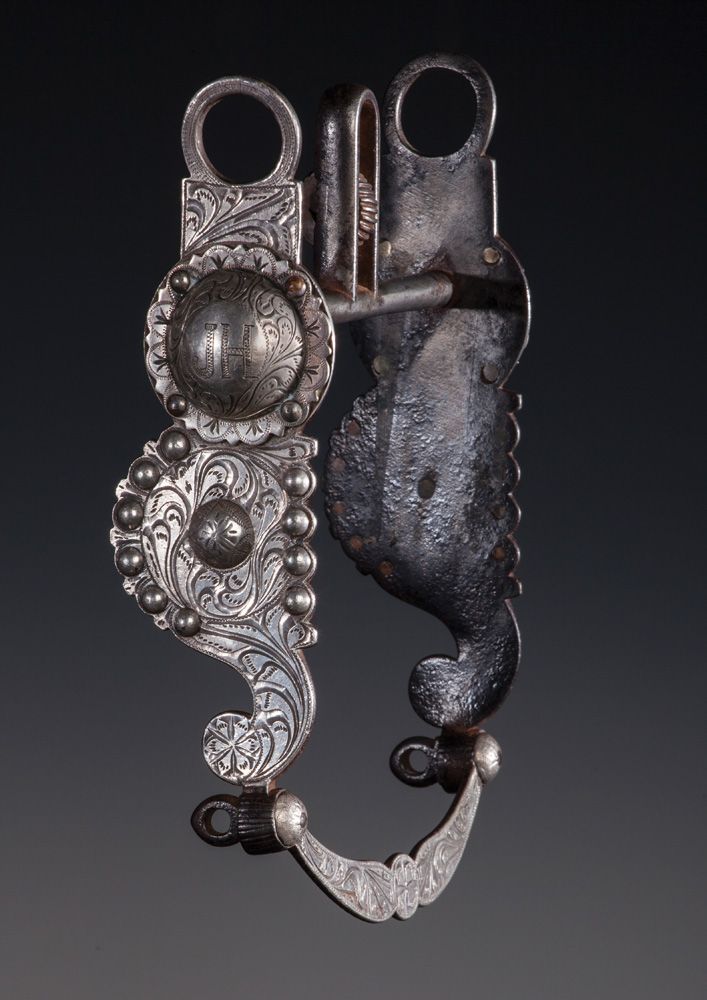 19th century Leopold Gomez Spade Bit. Rare, pre-1900s silver overlaid Northern California high and narrow half breed bit, artistically and elegantly engraved by Leopold Gomez, a partner with Joaquin Hernandez in San Jose. Cheeks adorned with a scalloped and monogrammed 2" concho. Silver mountings in fine condition, iron shows a moderate level of rust typical of exposure moisture from the Pacific ocean. PROVENANCE: Dick Powell Collection, Casa Grande, Arizona.