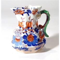 19th century Masons Ironstone octagonal jug, hand coloured and transfer printed with Imari style flowers and a snake handle, marks to base, 13cm high