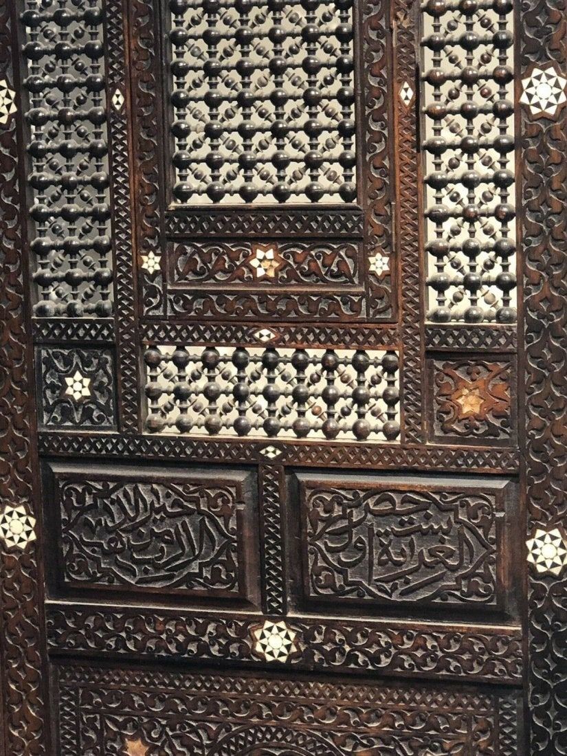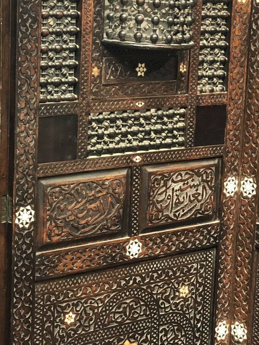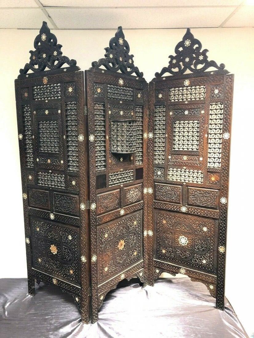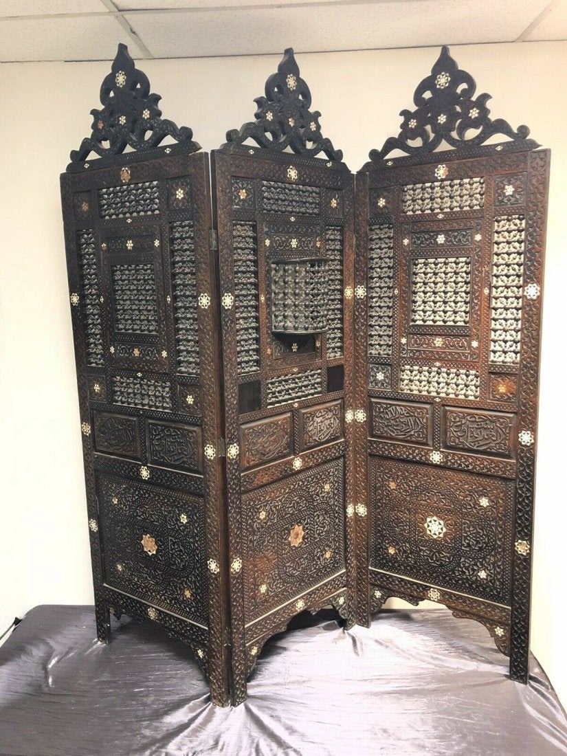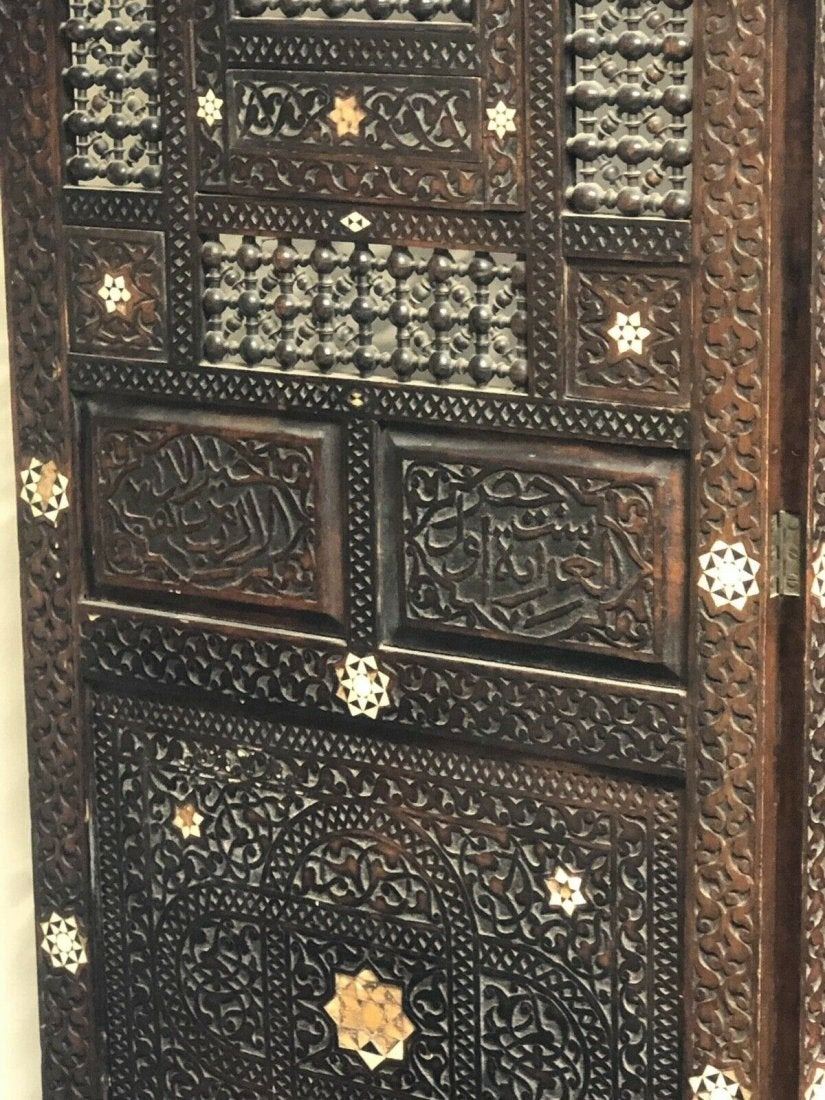 19th century Middle Eastern Syrian three Panels Screen. Fine antique three panels wood screen with florlal design and Arabic calligraphy. each panel 75 3/4 inches high x 24 inches wide. wear and losses as seen in images.