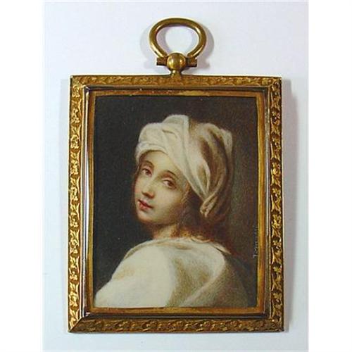 This beautifully painted miniature signed by "Tomassi" is after the famous painting by Guido Reni. Beatrice Cenci was a beautiful Italian teenage girl. She instigated the killing of her brutal father and was executed in Rome in 1599. The portrait of Beatrice by Guido Reni is in the Barberini gallery. It is in a lovely .25" wide bronze frame.
