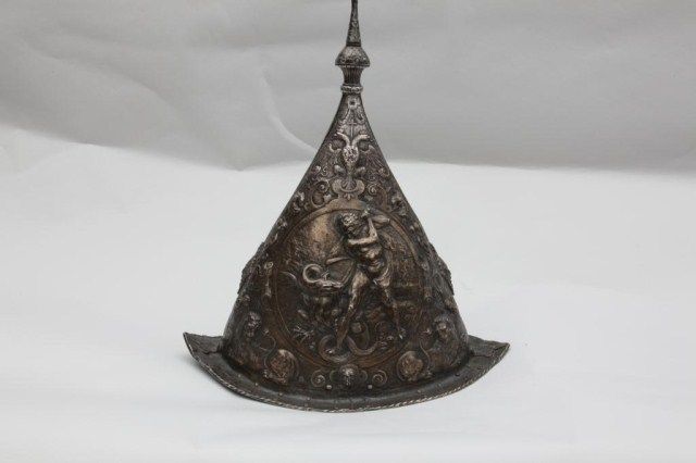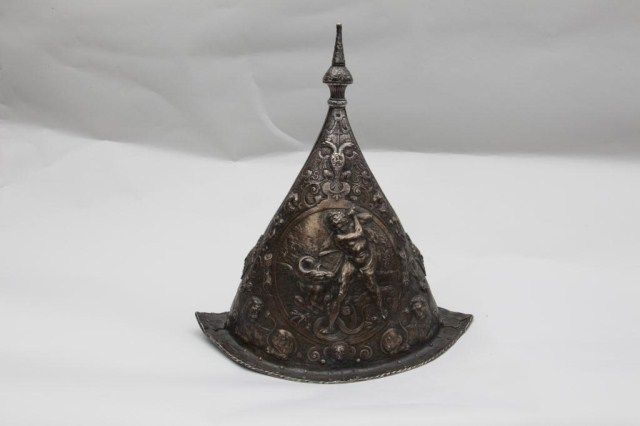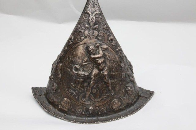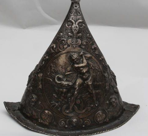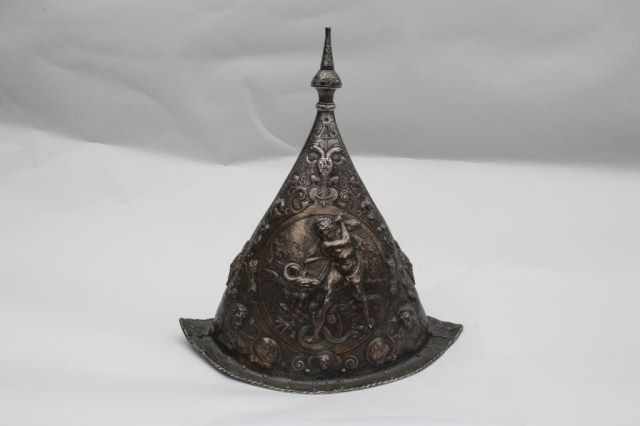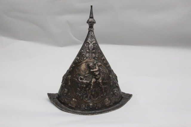 19th century Museum quality copy of magnificent Russian helmet showing “Elkington” mark and Department of Science and art logo probably authorized by Victorian and Albert museum or other publicinstitution. These high quality art pieces were offered to collectors’ in the 19th century for their study and enjoyment as fine armor was becoming rare even over 100 years ago. This is a genuine antique made byElkingtons’ patented process and is both ornate and beautiful. The helmet measures approx 17-3/8” in height by 19” width and shows ornate scenes top by Russian eagle. The center portions of each side show ancient warrior slaying demonic serpent. The border decoration shows stand of arms, lions, grotesque mask, Christian cross, scrolls, florals and other decorative motifs. The condition is near fine with a nice patina and no cleaning or polishing to the detail. These Victorian era helmets have become sought after by collectors and a British museum is currently preparing a display of Victorian arms and armor. Recently a similar