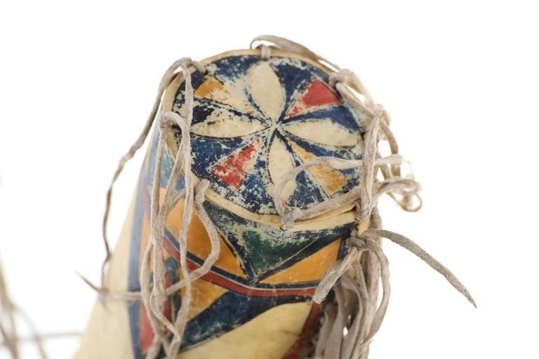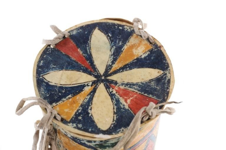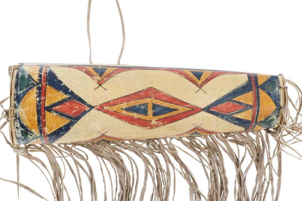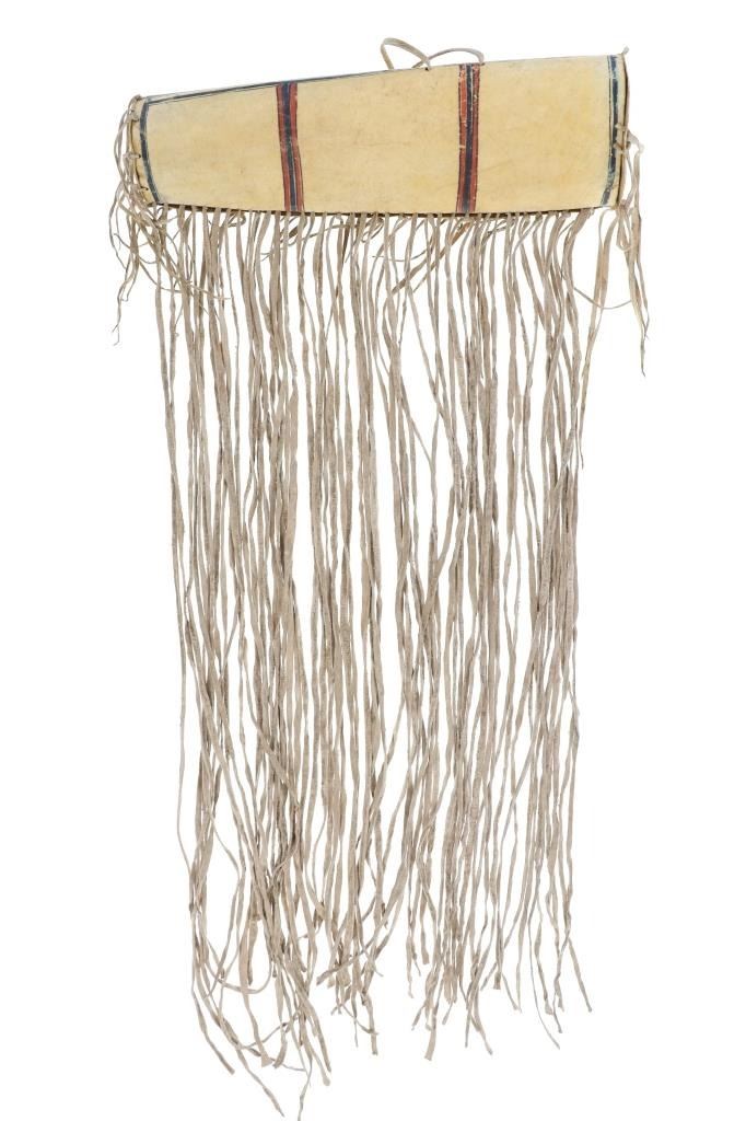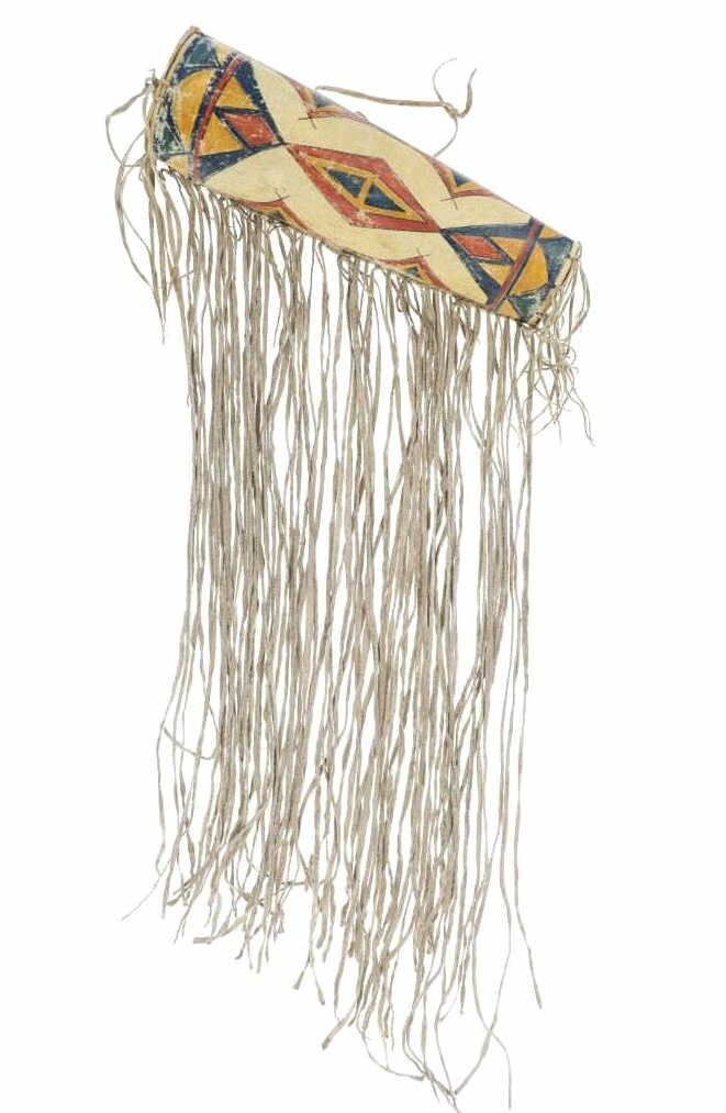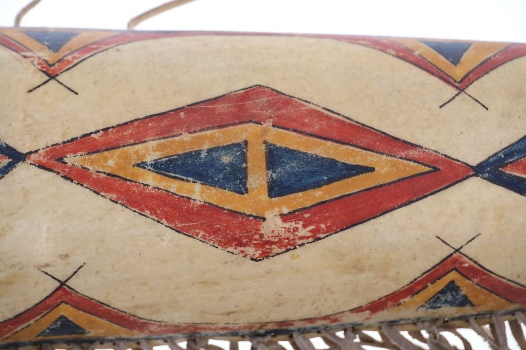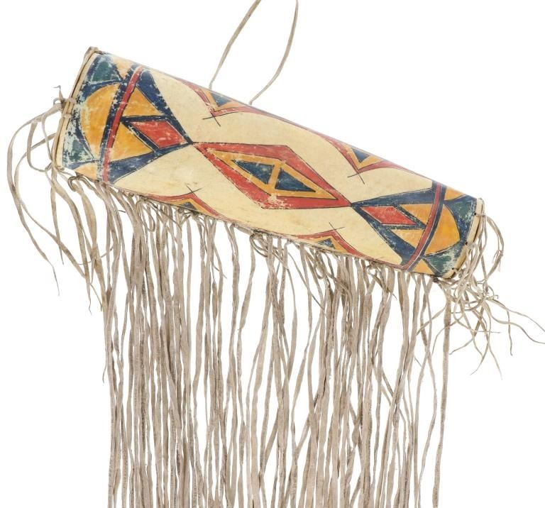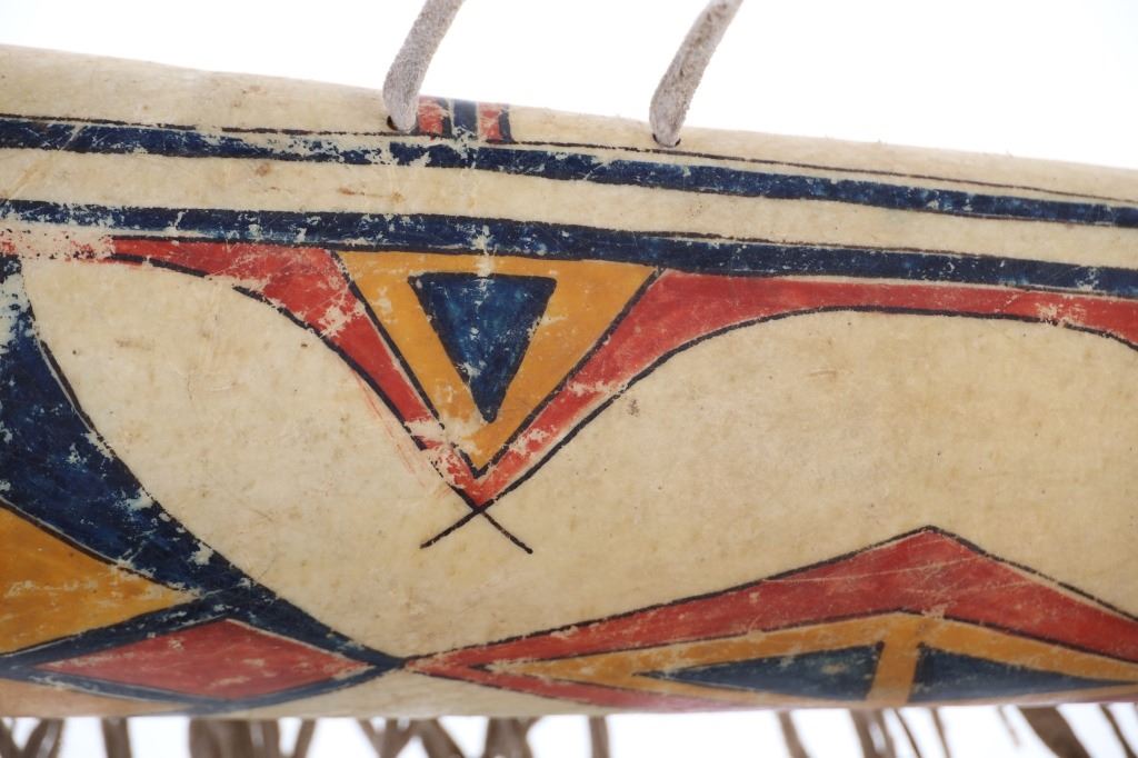 This is a truly historic and artistically stunning,19th-century parlfeche polychrome painted war bonnet case from the Northern Plains in a massive, rare size. The piece exhibits an unusually large size and shows parfleche rawhide hide that is Indian tanned hide sewn and is covered in beautiful polychrome mineral pigment painted geometric designs on both sides as well as the lid and bottom. The appears to be from the Apsaalooke / Apsáalooke Crow. The lid, bottom and side have long Indian tanned hide fringes that truly set the piece apart. The artwork shows colors of red, green, blue, yellow, with black outline and with prominent thick Indian tanned hide fringes beautifully hanging from the bottom. This is quite possibly one of the best 1800's era war bonnet cases offered for public sale. The piece is well preserved with rich coloring and no major damages or loss. The piece shows the correct wear and loss to the paint that would be expected on such an early and authentic example. Measures overall as displayed 64-inches long, the case without fringes is 22-inches long by 7-inches wide by 6.5-inches deep. Of the other examples previously offered, this appears to be one of, if not the largest and would have held and impressive feathered headdress or war bonnet. From the same collection as the bonnet case sold by our company earlier this year for nearly $3,000 being slightly smaller (this example being slightly bigger).