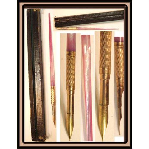 </font></strong>For all you ladies who LOVE PINK , here is a lovely vintage Victorian era quill or dip pen made by Aiken Lambert & Co in the late 1800's or early 1900's. This late 19th Century dip pen had a PINK mother of pearl handle and either a gold or gold filled nib with a gold or gold filled part that holds the nib. The nib is marked AIKEN. The geometric pattern, otherwise known as chased and engraved is a lovely example of work of this period. It has a beautiful engraved Art Deco design in the gold. It comes in its original leather box that is hinged with two sickle shaped sliding hooks. Aikin Lambert claimed to have been in business since 1864. Throughout the 1800s they produced a wide variety of mechanical pencils, jewelry and gold dip pens. Their pencils were of the magic style, twist actions and many were figural taking shapes such as bottles, bells and many others. They also produced toothpicks, ear spoons and thimbles. They sold wide selection of gold dip pens nibs from small to huge and in every style that was in demand. Many fountain pen companies purchased nibs from them to use in their pens including Waterman and Wirt.
