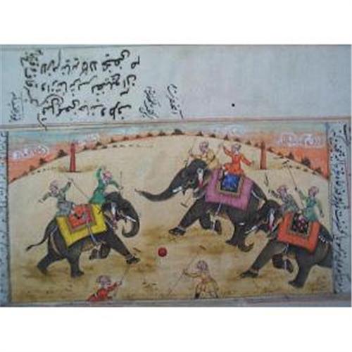 19th. century AD Persian manuscript leaf with miniature painting of polo players using elephants. The reverse features excellent Islamic calligraphy. Dimensions: 8.5 inches x 6 inches. The leaf is encassed in plexiglass cover and is in excellent condition for age. This is not a modern painting, but an antique miniature painting on manuscript leaf of the period. Estimated value: $800.