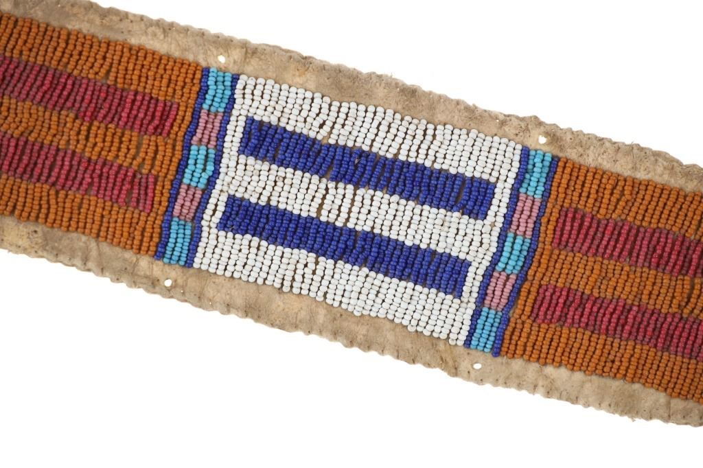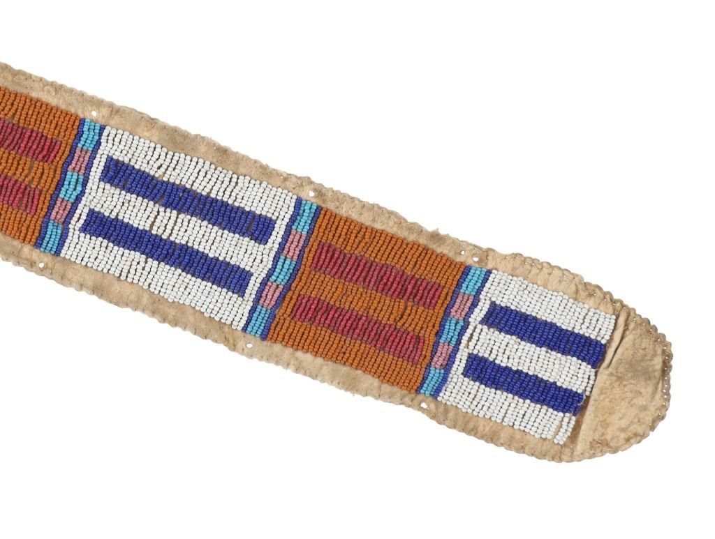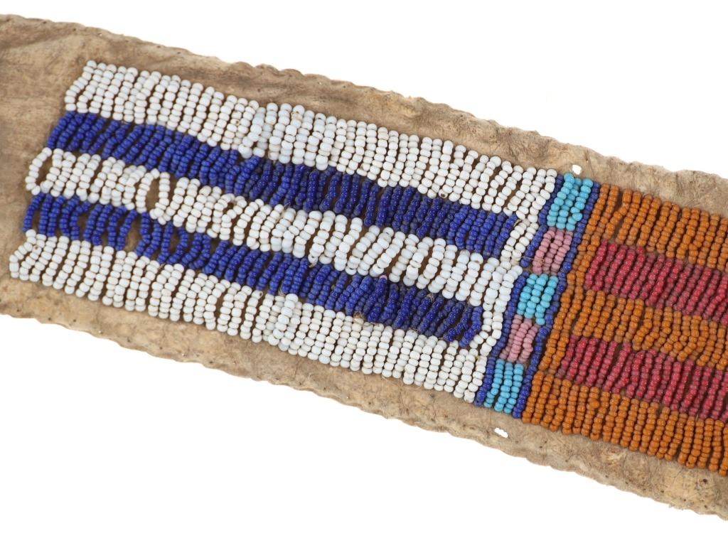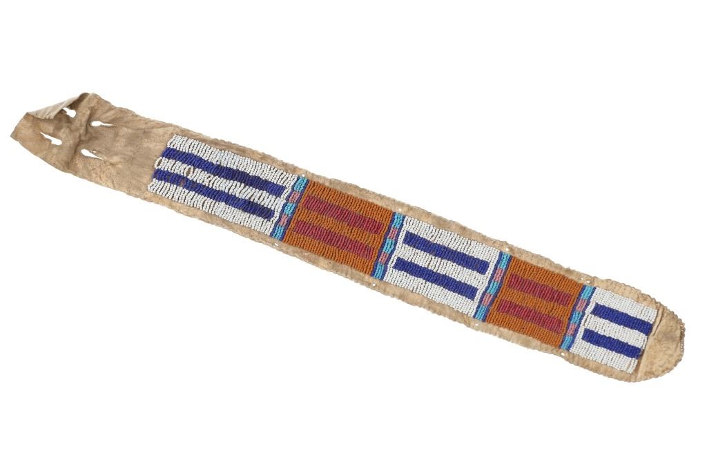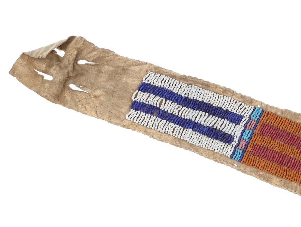 The lot features an Indian tanned buffalo hide drop with fantastic beadwork dating to the 19th-century from the Sioux of the Northern Plains. The piece exhibits Indian tanned Buffalo / Bison hide with sinew sewing and is covered in amazing geometric beadwork which is also sinew sewn. The beadwork shows colors of chalk white, cobalt, greasy butterscotch yellow, red white heart, greasy Cheyenne pink, greasy light blue, and medium blue. The piece likely started its life as a war shirt strip and later was used as a drop for a war club, lance or belt with the attachment holes at the top. Likely dates to circa 1860-1880's. The edge has a zig-zag scalloped edge and bottom has a curve. Measures overall when laid flat 19.5--inches long by 2 5/8-inches wide. Has nice patina.