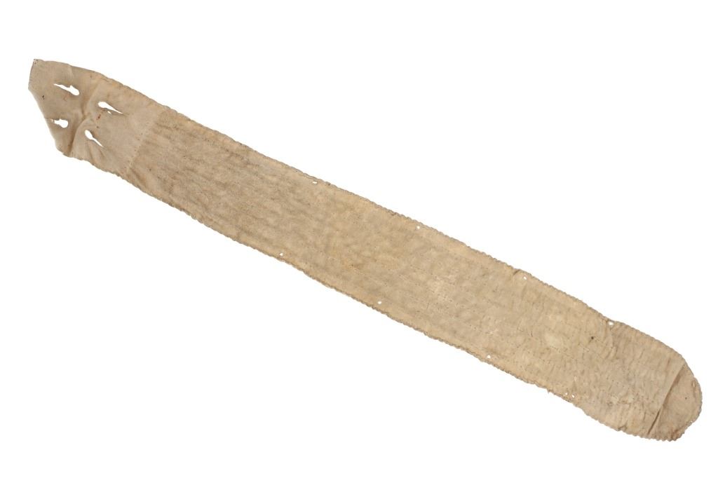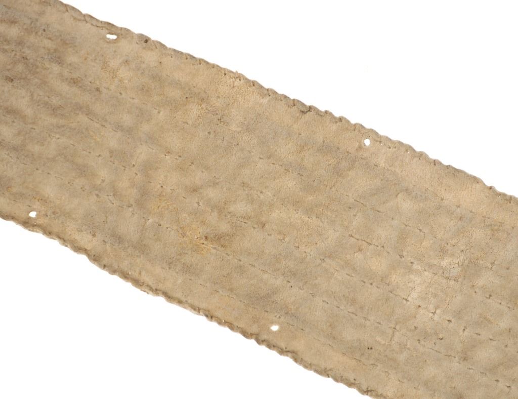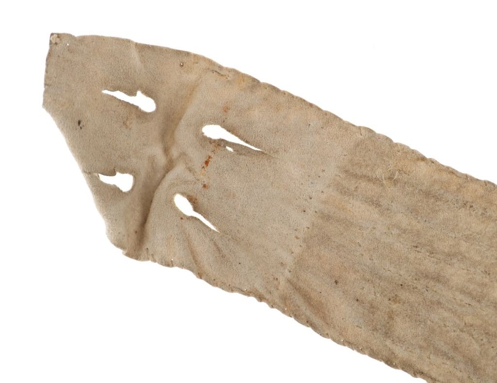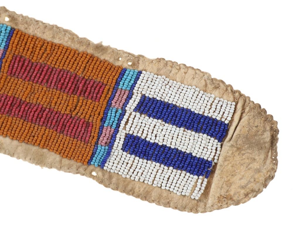 The lot features an Indian tanned buffalo hide drop with fantastic beadwork dating to the 19th-century from the Sioux of the Northern Plains. The piece exhibits Indian tanned Buffalo / Bison hide with sinew sewing and is covered in amazing geometric beadwork which is also sinew sewn. The beadwork shows colors of chalk white, cobalt, greasy butterscotch yellow, red white heart, greasy Cheyenne pink, greasy light blue, and medium blue. The piece likely started its life as a war shirt strip and later was used as a drop for a war club, lance or belt with the attachment holes at the top. Likely dates to circa 1860-1880's. The edge has a zig-zag scalloped edge and bottom has a curve. Measures overall when laid flat 19.5--inches long by 2 5/8-inches wide. Has nice patina.