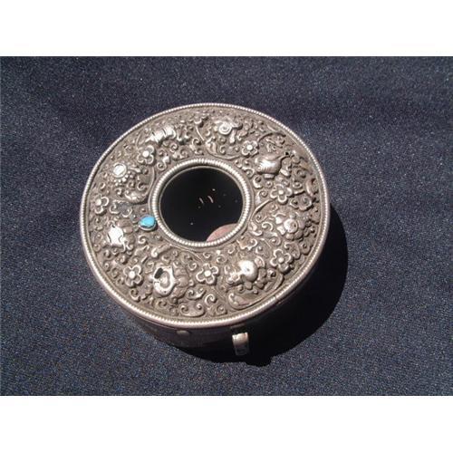 19th. century Tibetan silver Gao with relief incised decorations featuring Buddhist emblems and turquoise. Diameter: 4" (10 cm.). Estimated value: $2000.