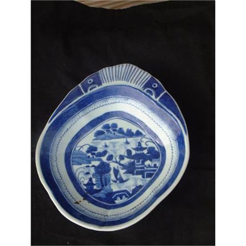 Antique Cantonese porcelain shallow bowl in shape of a shell. It has blue on white under glaze decorations with a landscape design. Size: 10.2" X 9" (26 cm. X 23 cm.).