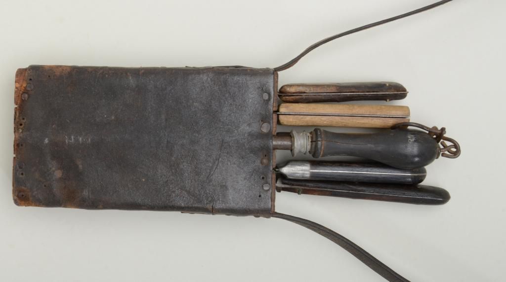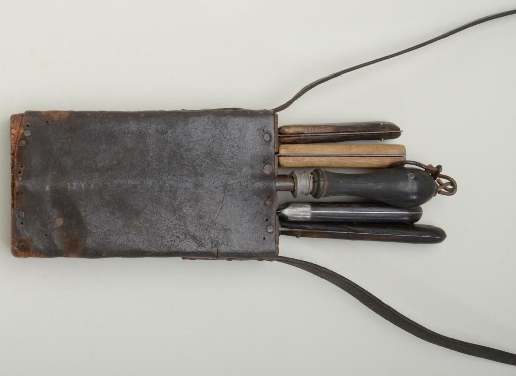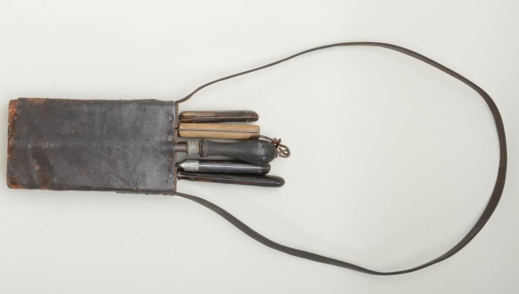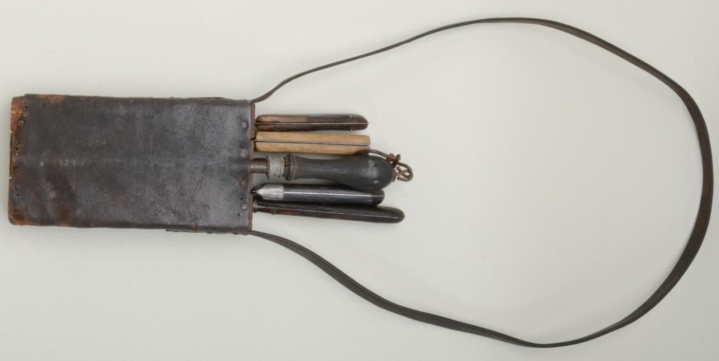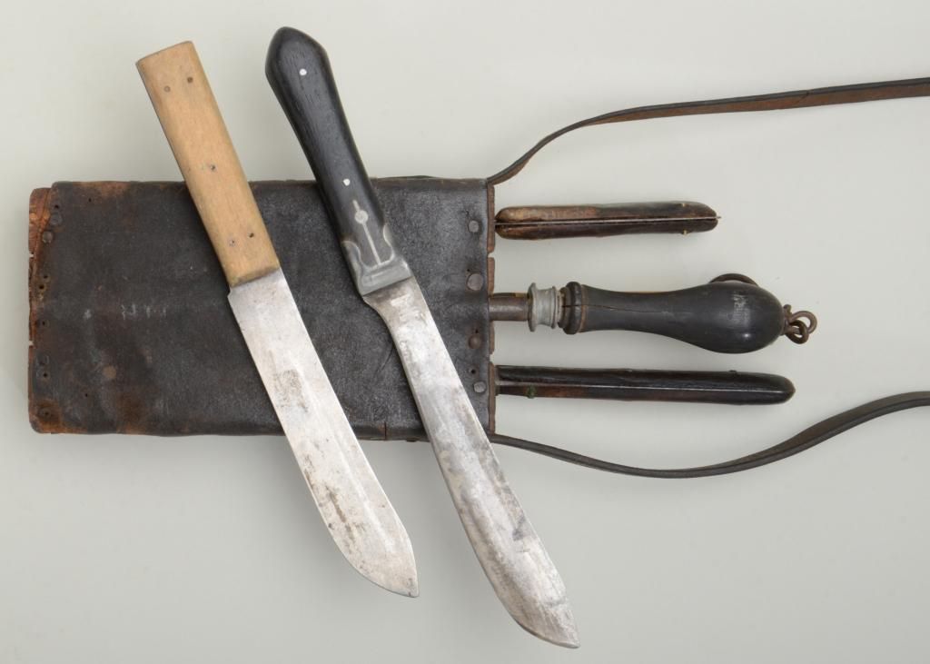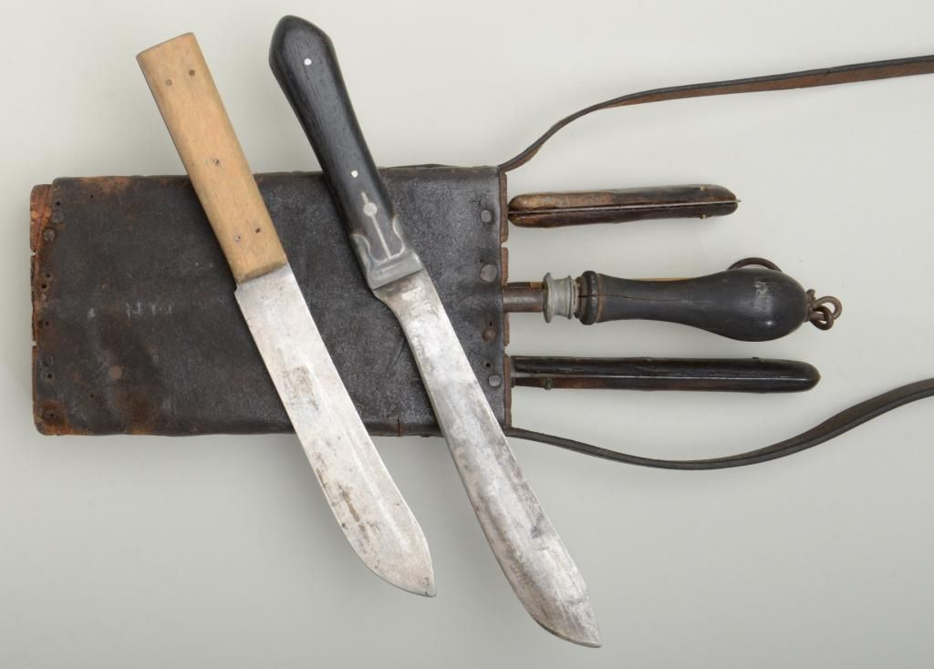 19th century butchers set consisting of five knives, a sharpener, a carrying block with leather cover and strap of the type favored by buffalo skinners in the old west and great for display with frontier rifles. One blade is marked "Russell Green River Works" and is in good to very good condition; one shows a hardware company marking that is barely legible with pewter inlaid grip; two are unmarked and are sharpened almost all the way down from repeated and long use; and one marked "Marvill Regan Sheffield" in fair to good condition. Condition is good to very good and the set has a very nice appearance. Est.: $600-$1,200