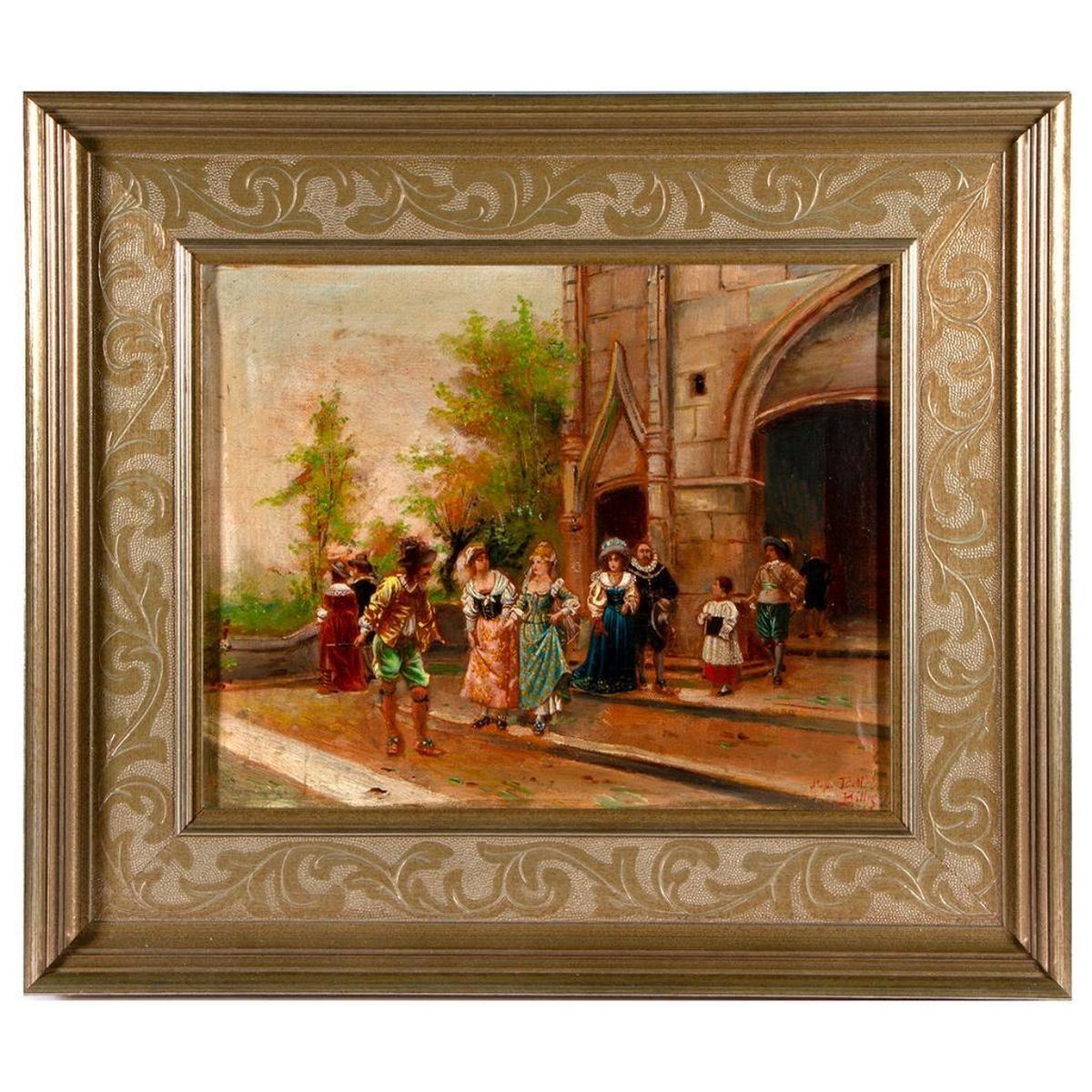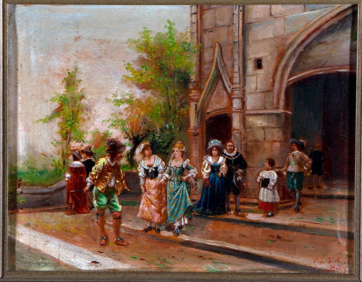 Artist: "Billis". Title/Subject: Courting scene in front of a cathedral. Signature: Lower right. Medium: Oil on canvas. Size image: H - 8 1/2" W - 10 1/2". Size frame: H - 14" W - 16 1/4". Created: 19th century. Condition: Good.