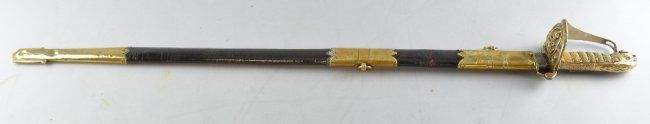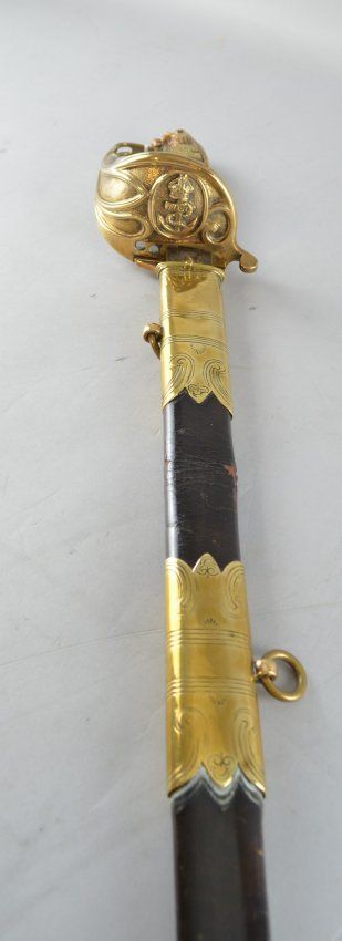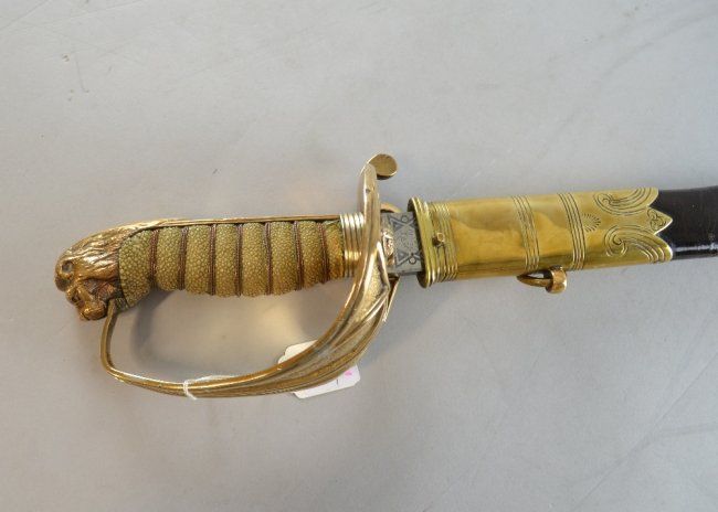 19th century naval officer's sword, with etched fullered blade, shagreen and wire grip, brass guard and lion's head pommel, in leather and brass mounted scabbard, 37" long.