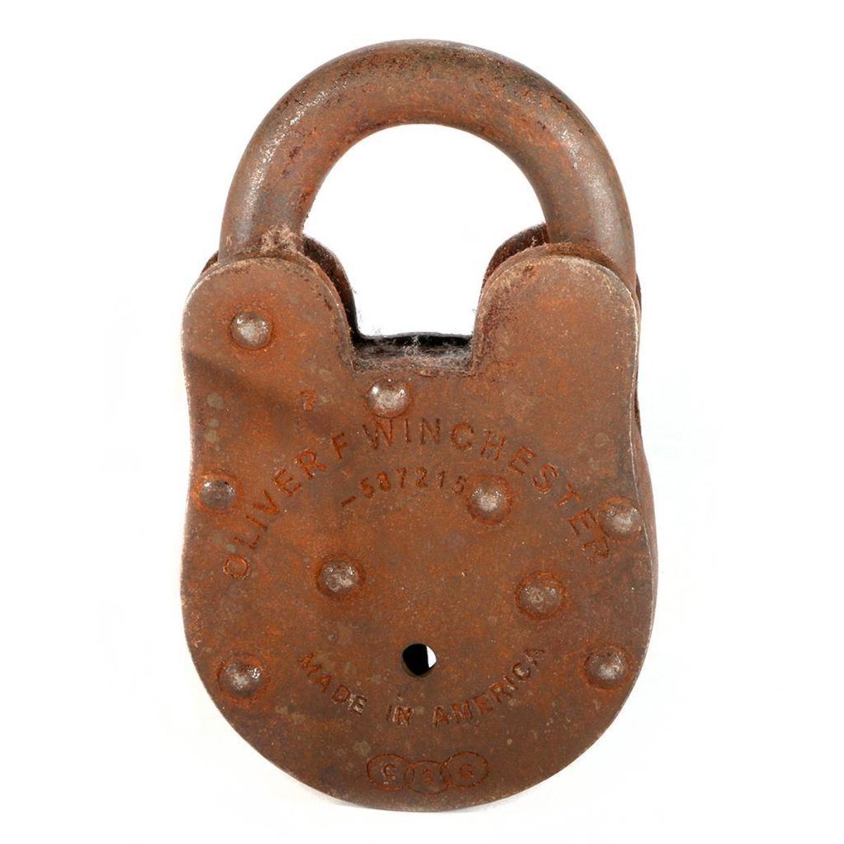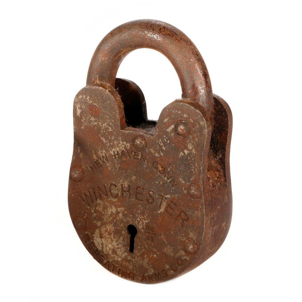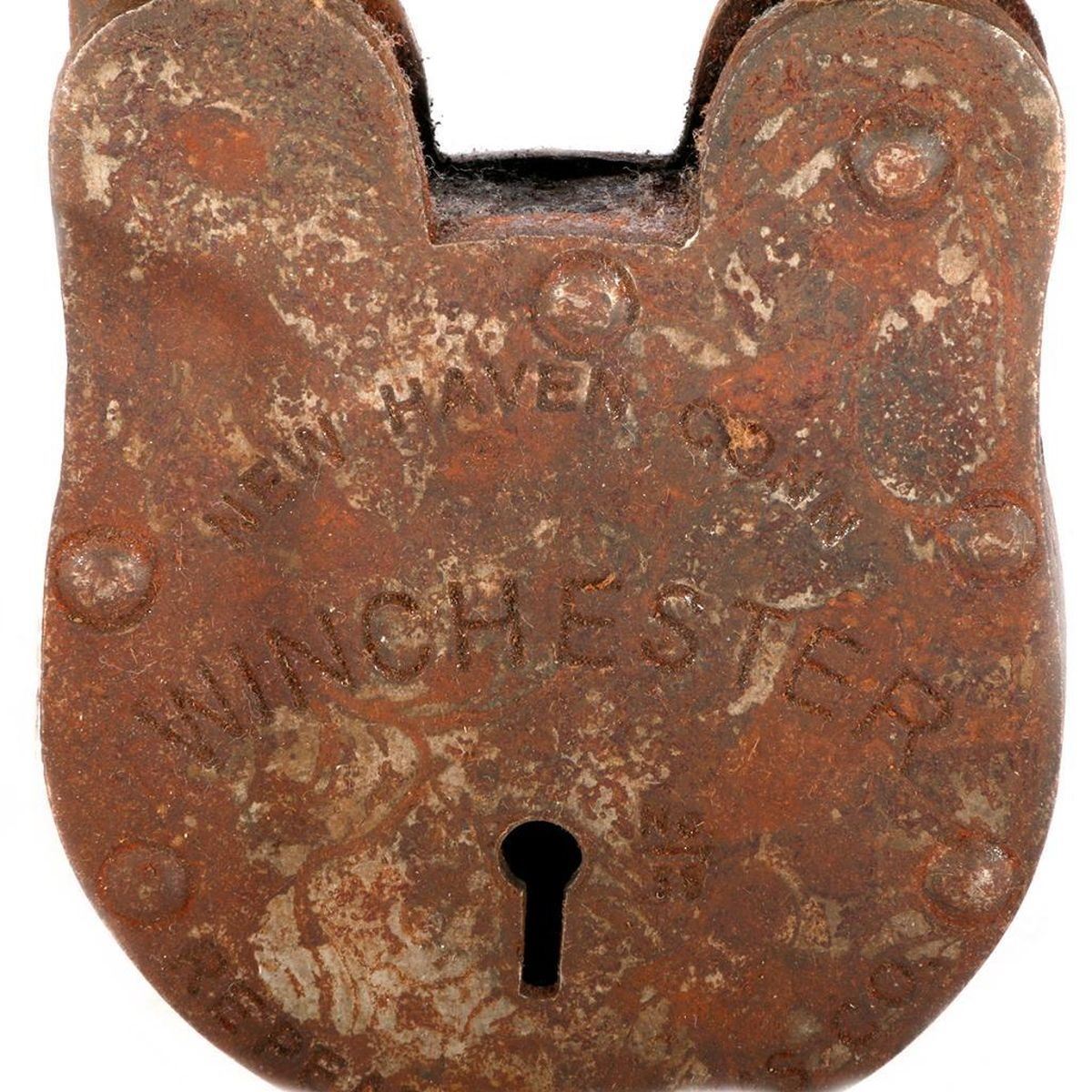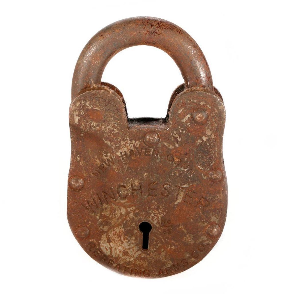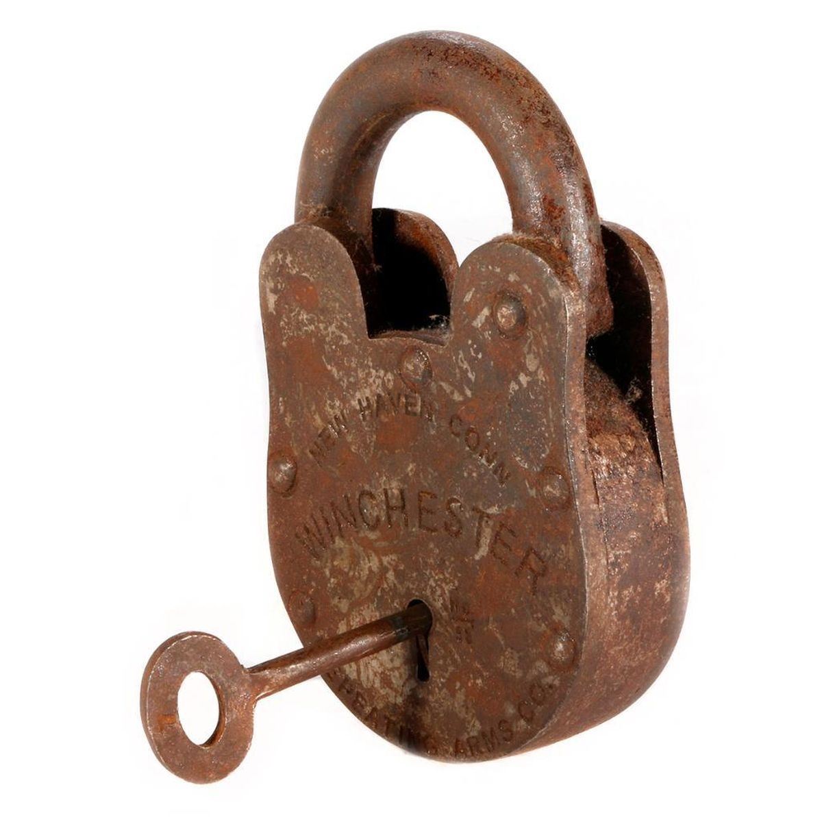 A 19th century Winchester padlock and key measuring 5 1/4 inches high x 3 x 1.