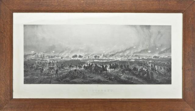 19th century steel engraved print entitled Gettysburg – Repulse of Longstreet’s Assault, published by James Drummond Ball, Boston Mass. Marked right corner, Engraved by H. B. Hall Jr. Center titled Historically Arranged by John Bachelder. Left corner, Painted by James Walker. Top is marked Entered According to Act of Congress, 1876 by John B. Bachelder, in the officer of the Library of Congress, Washington. Measures approx. 21” by 41”, is in an antique oak frame. The print is in good condition, there is some scratching in the glass, and some minor fading and slight acid burns from the paper. Generally very good plus. Many of these prints were offered at special rates to GAR veterans. Est: $350 - $700