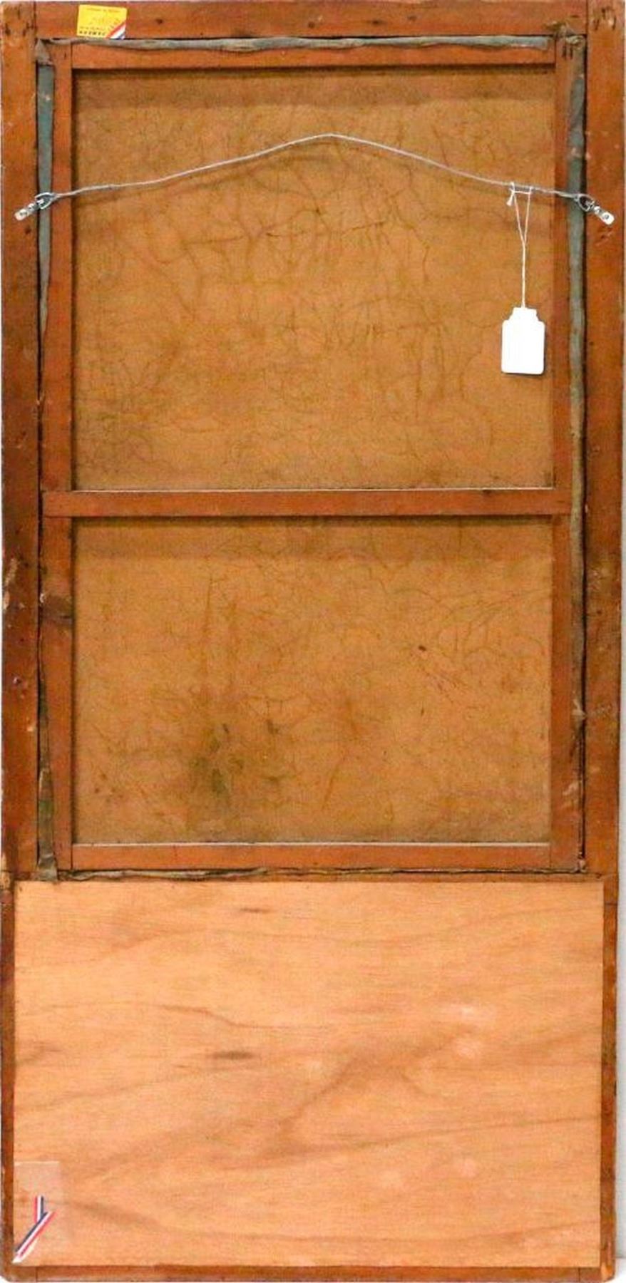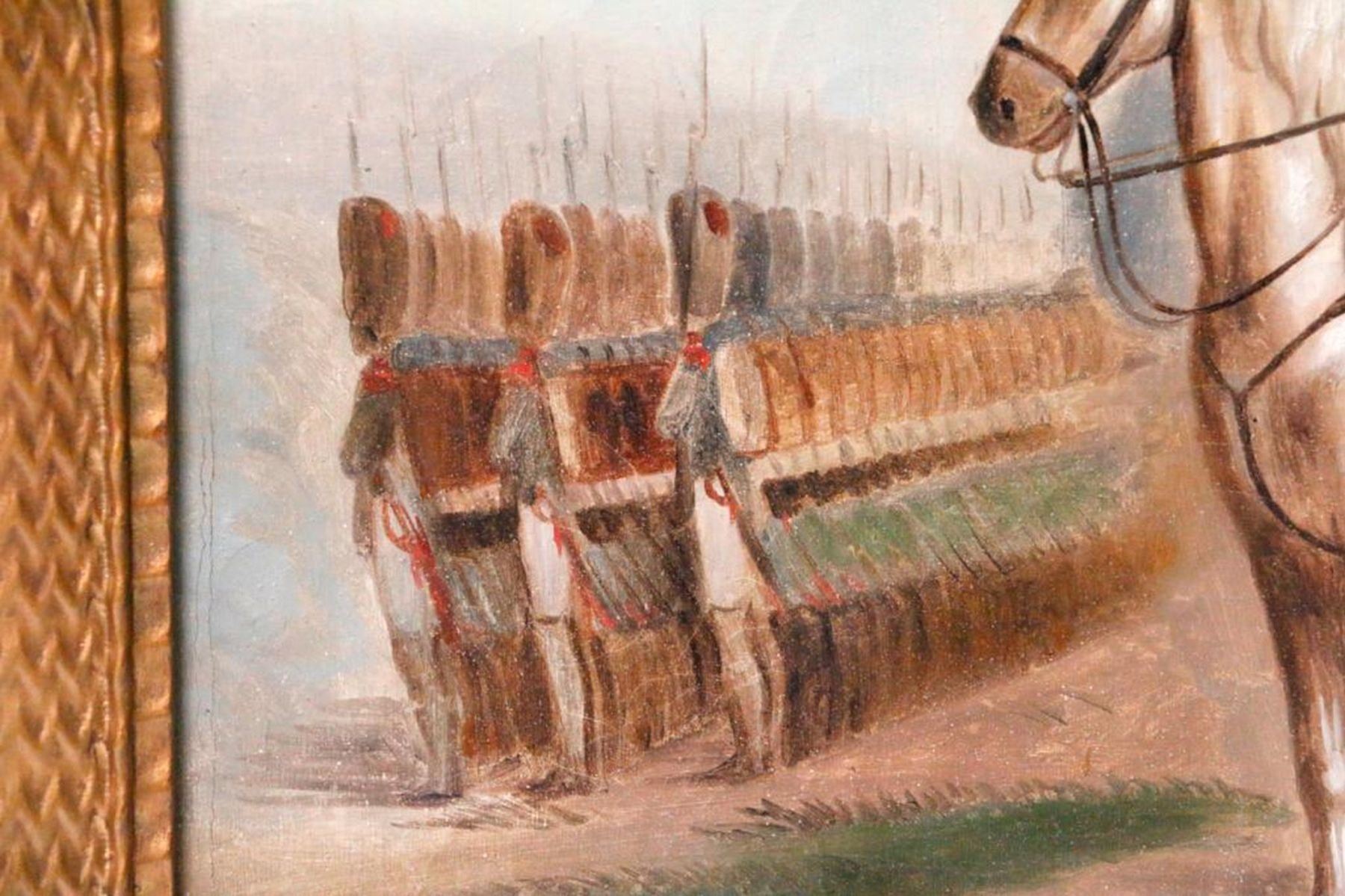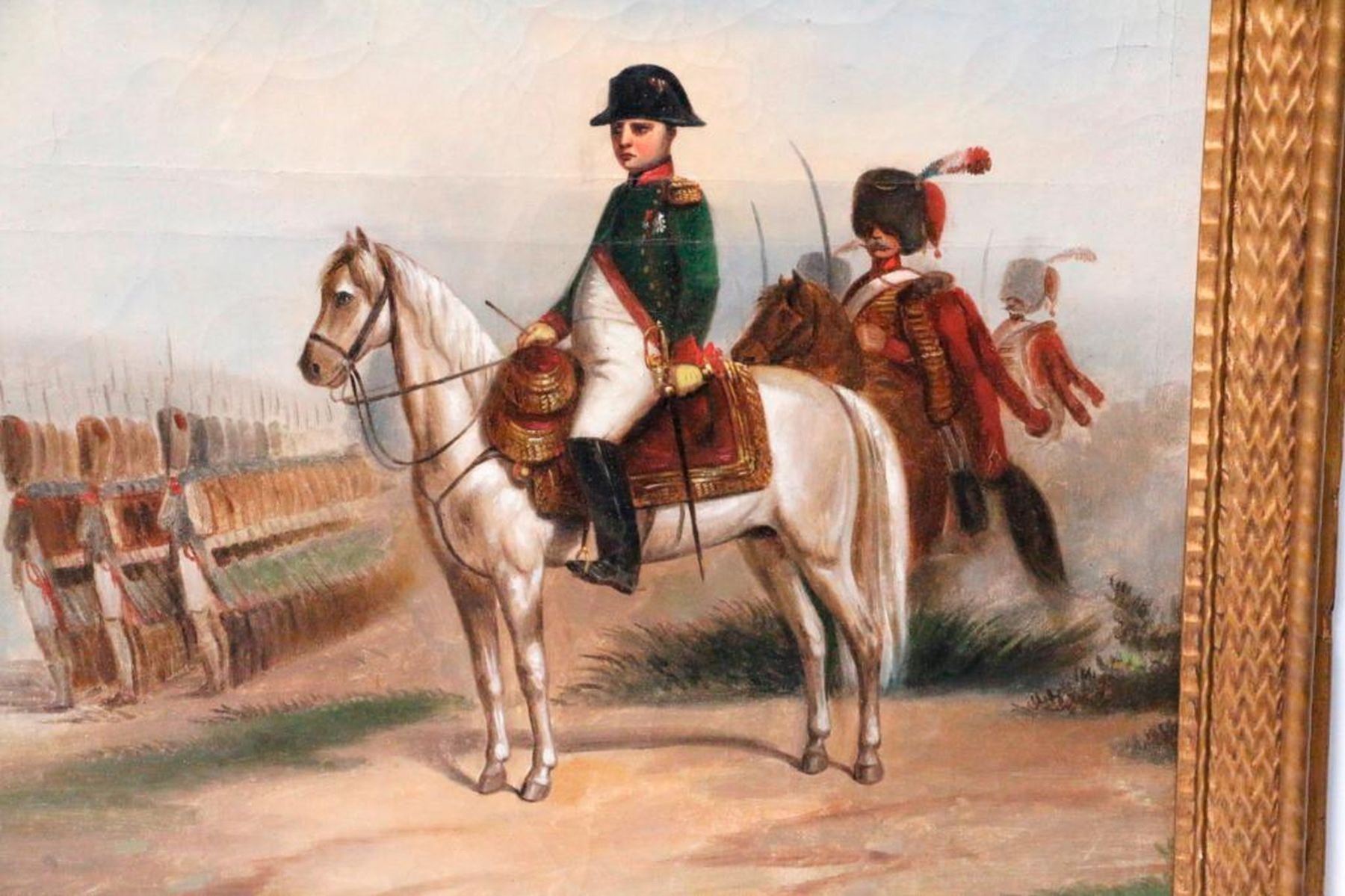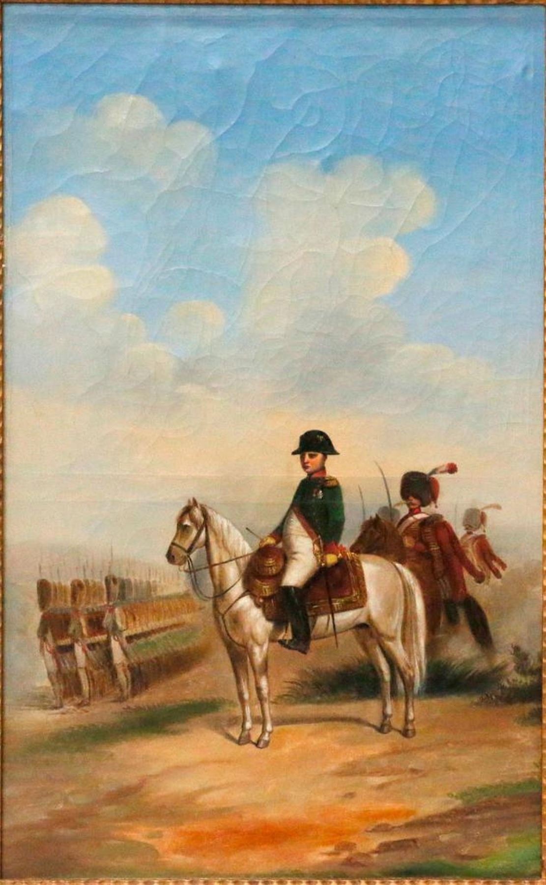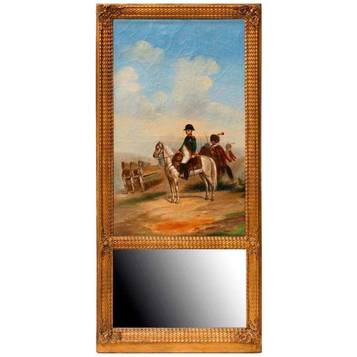 A 19th Century trumeau mirror with a painting of Napoleon and his troops measuring 56 1/2 inches high x 26 1/2 wide.