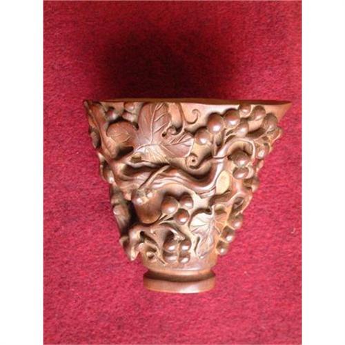 <table width="100%" border="0" cellspacing="0" cellpadding="4"><tr><td><em> </em></td></tr><tr> <td width="100%"> 19th. century wood carving in shape of medieval libation cup made from rhino horn. The sides are carved in high relief with grapes and grape leaves design. The tendrils of the grape vines are extending to the inner upper opening of the cup. The carving is extremely well done reaching perfection of human hand skills. Estimated value: $1.000. </td></tr><tr> <td> </td></tr><tr> <td>Reference #: 275001</td></tr><tr><td>Condition:Excellent. No damages</td></tr><tr><td>Year:19th. century</td></tr><tr><td>Country:China</td></tr><tr><td>Height:3.8" ( 9.5 cm.)</td></tr><tr><td>Width:4" (10 cm.)</td></tr><tr><td>Title:19th. century wood carving libation cup</td></tr><tr><td>Materials:Carved wood</td></tr><tr><td>Location:Fishkill, New York</td></tr></table>