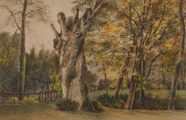Fall forest landscape scene. Watercolor on paper. Unsigned. Scrolling leaf gesso frame. Sight: 9" x 13 1/2". Frame: 20 1/2" x 24 3/4".