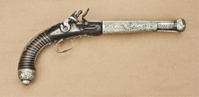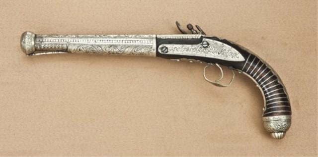 19th to 20th century ornamental flintlock pistol from north Africa to middle east. Measures approx. 15-3/4” overall with 9-1/4” barrel. The pistol is covered with ornamented silver-colored metal and silver bands. The quality of the workmanship is crude and the pistol was made more of an ornament that a firing instrument as it has no breech, just a hole drilled in the barrel. However, this was not a tourist piece; it was actually made 75-100 years ago to wear as an ornament and a position authority in our opinion, similar to men’s jewelry. Est: $400 - $800
