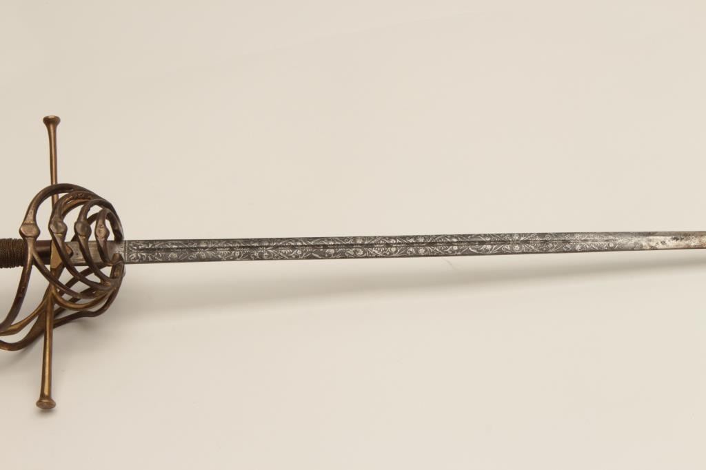 19th to early 20th century armor made copy of 17th century rapier. Measures 41 ½” overall with a 33” finely etched blade. Brass hilt with wire wrap which is coming loose and unraveling. Est.: $175-$350