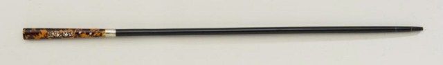 19th to early 20th century ladies walking stick with pearl inlayed into shell grip and blackened hardwood shaft approx 34-1/4" overall, fine to near excellent condition showing just slight aging. The inlay isaccented by brass wire and is influenced by Japanese Shibiyama work which was popular in America at the turn of the century. Est.;$500-$1,000.