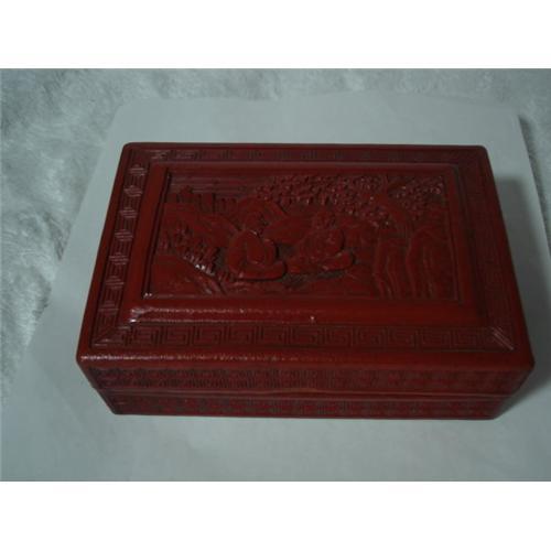 This cinnabar box is marked China. The carving has 2 people sitting cross legged facing each other, mountain & hill side in background, Trees & stones in for ground. Over all condition of box is good, has a few small paint chips on bottom edge, thus the price in very low.
