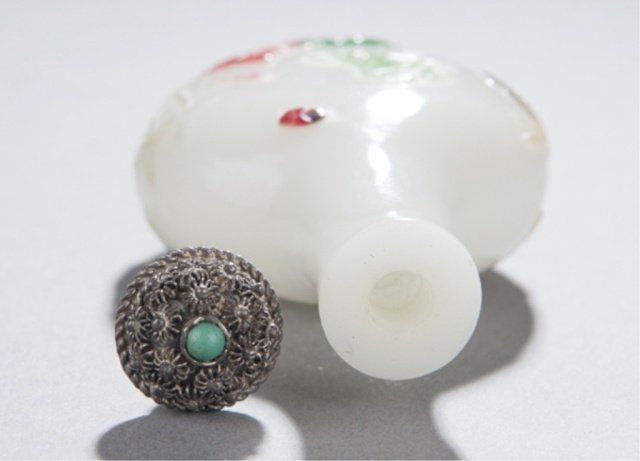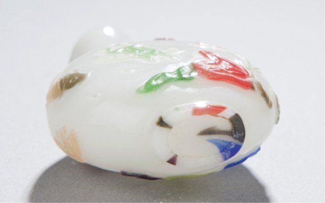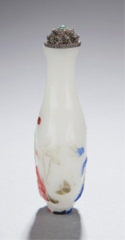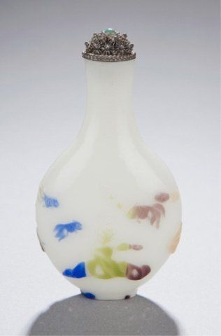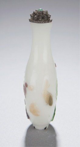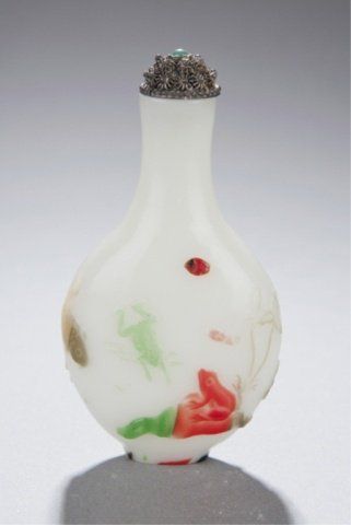 A glass overlay bottle. 19th century. Landscape scene with frogs and fish. 3"h. Property from Edward Englehart.