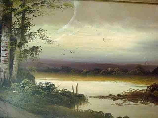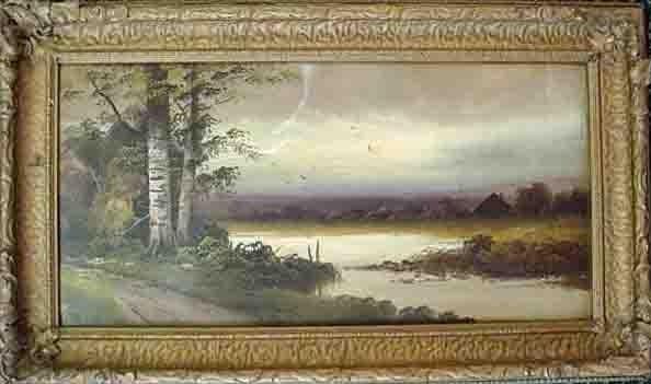 Oil on board rural landscape scene, Sunset Lake with Birch Tree. Oil on Board in original 3" carved gesso frame. 27 1/2" X 13".