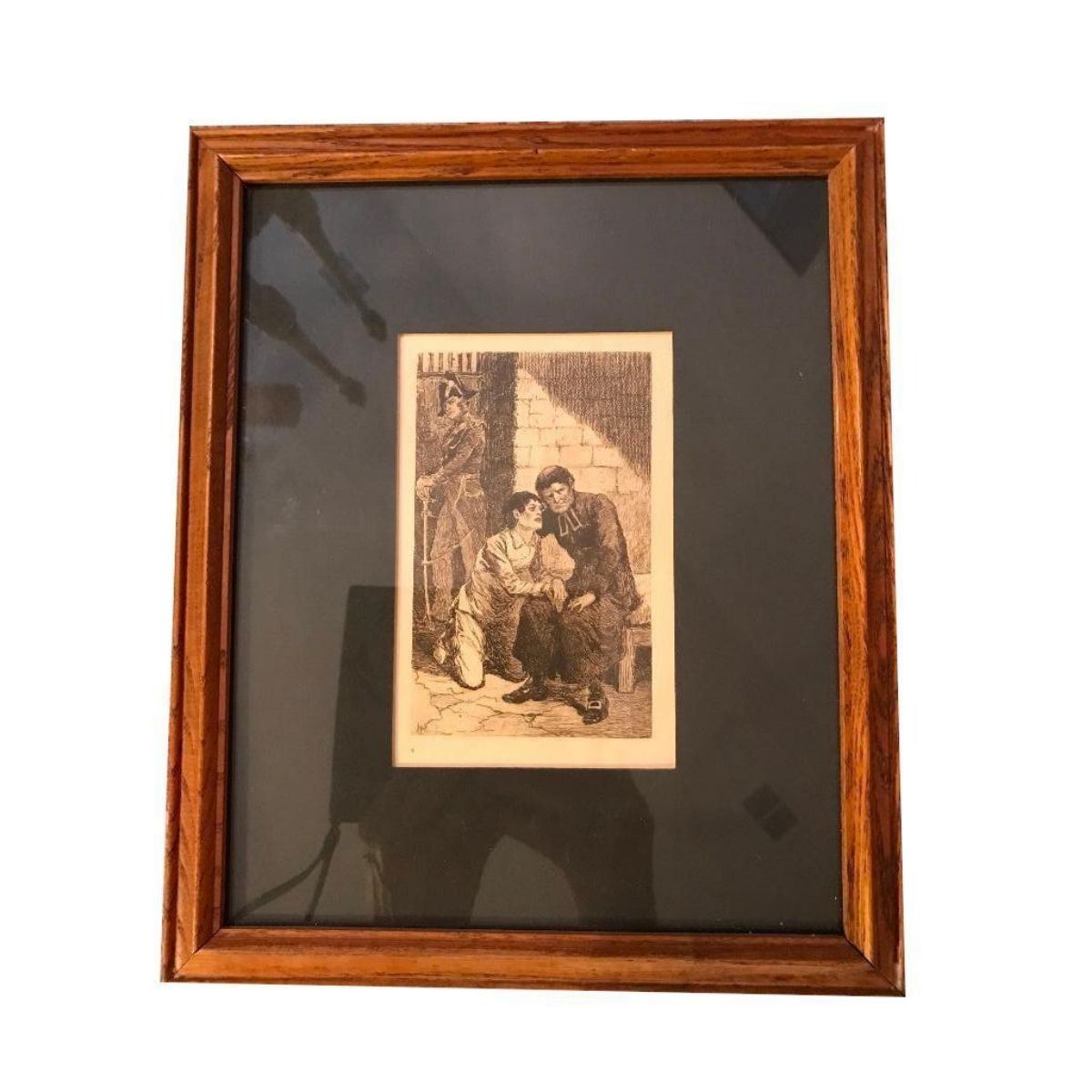 Antique 19th Century etching, signed to the lower left, depicts a prisoner making a confession with a soldier looking on. 3 1/2" X 5 1/2" in 9" X 11" wood frame.