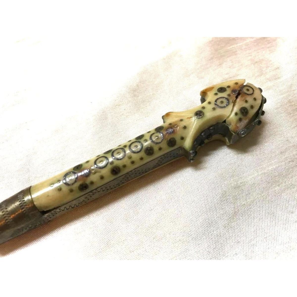 19thc Antique Islamic, Ottoman, Bosnian inlaid brass & bone knife & fork set. * fork has cracking to handle, as seen in photos.
