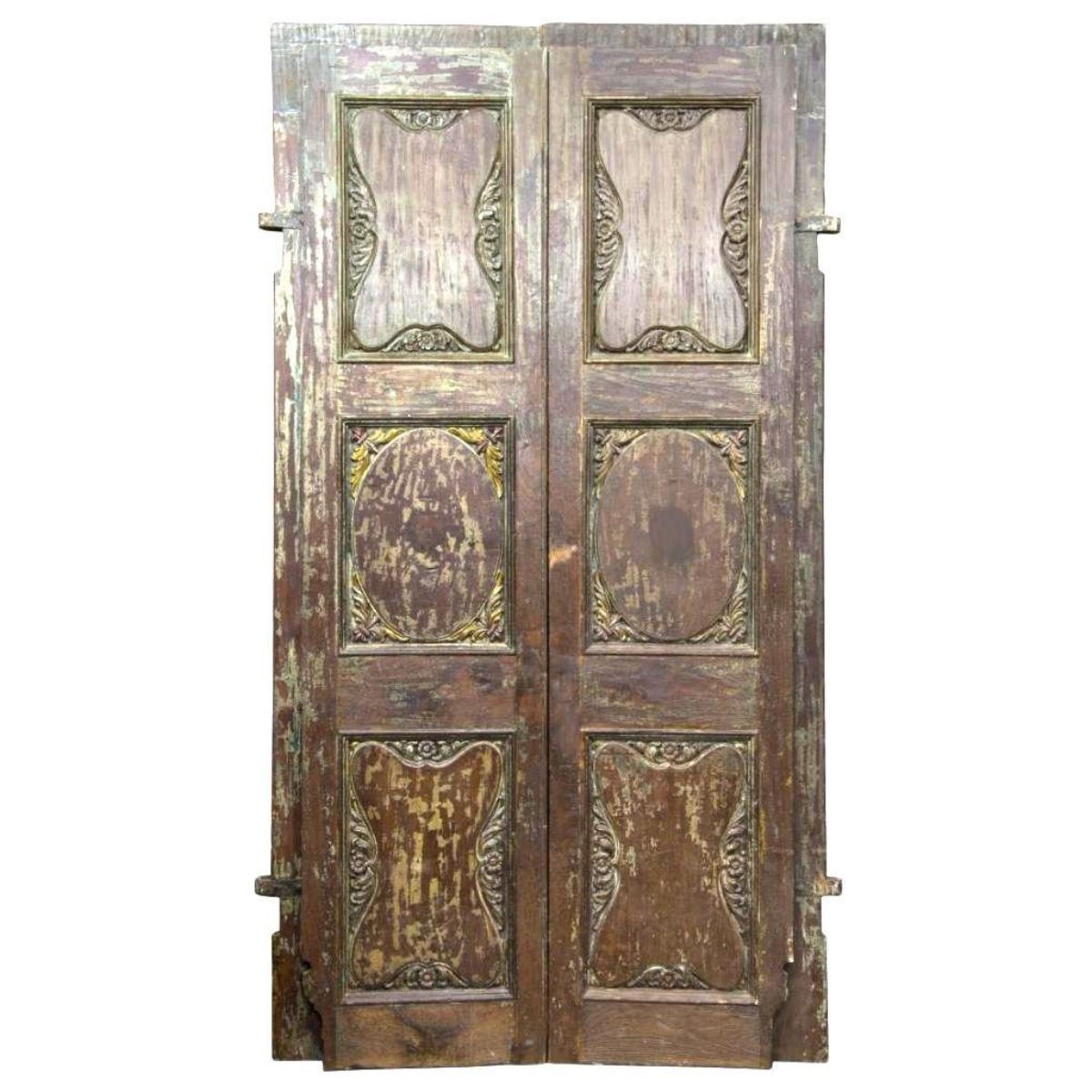 Late 19th - early 20th Century Architectural doors, each having three panels with center cartouche, surrounded by foliate carving. Remnants of paint remain. Approx 80" H X 40" W. - 9218-021718-IN-276