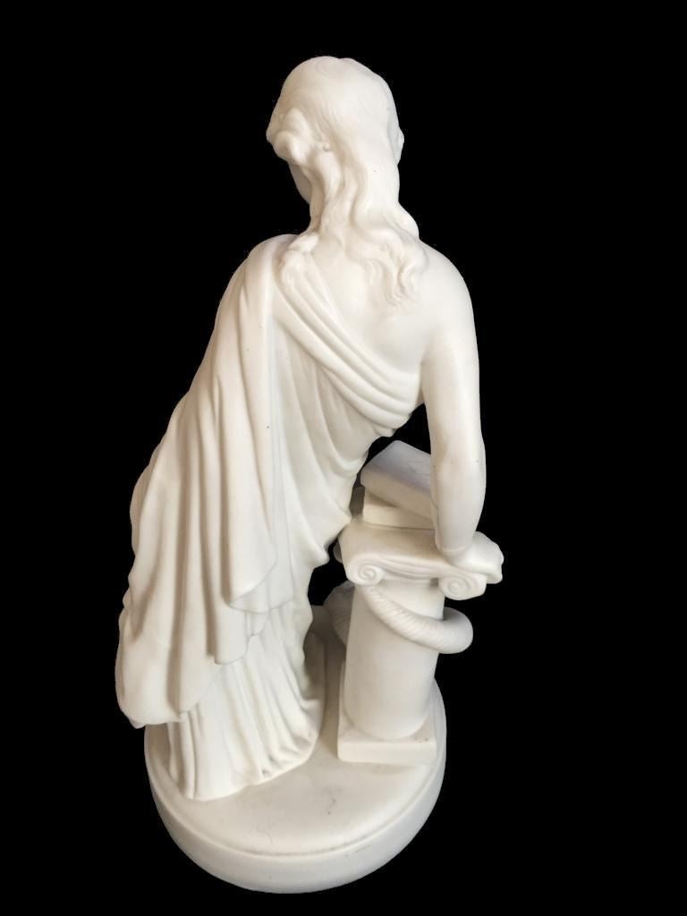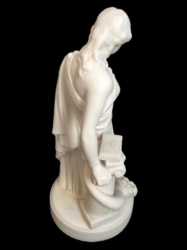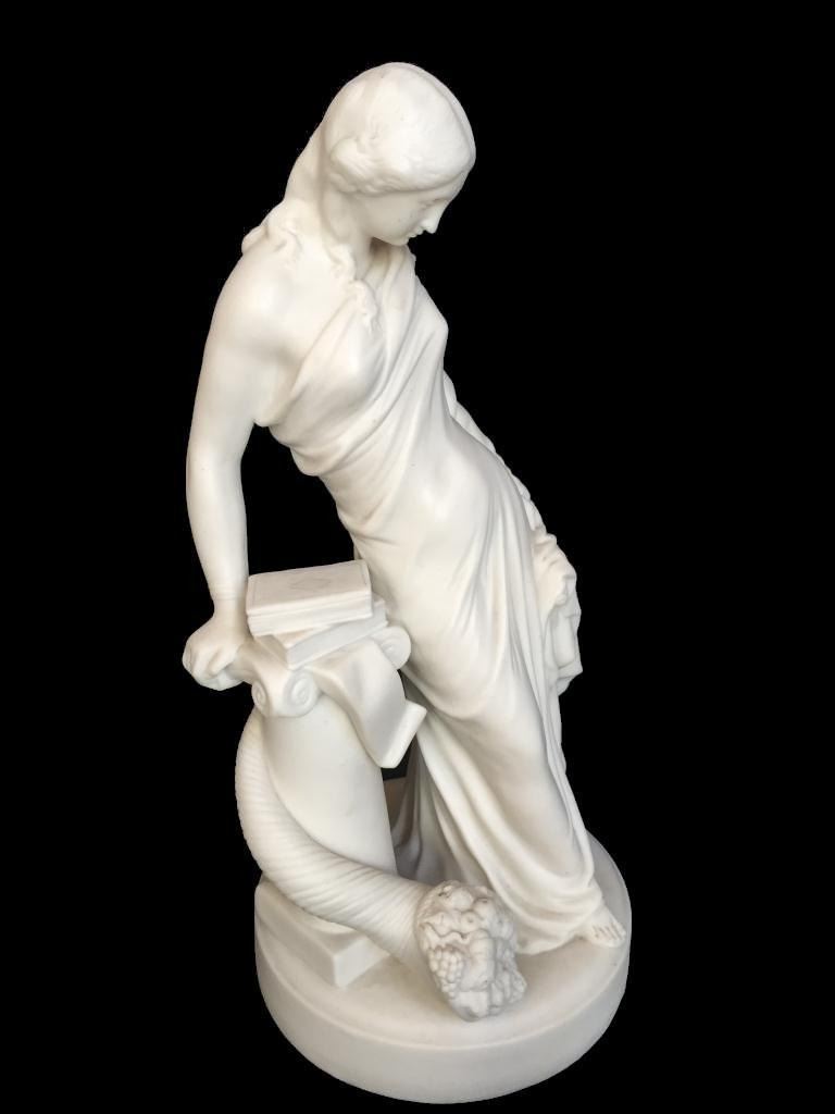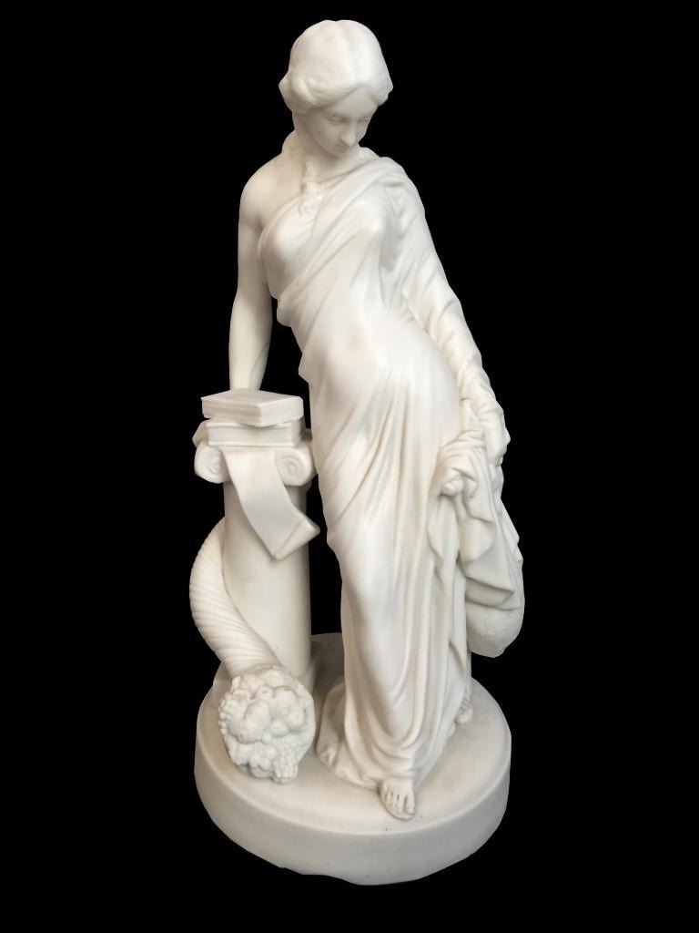 c1850 bisque parian ware figural sculpture of a classical Greek woman leaning against a column, topped with books & entwined by a cornucopia, horn of plenty filled with fruit. 15" H X 7" D. * crack lines visible on theback inside of the statue's arm, as seen in photos.