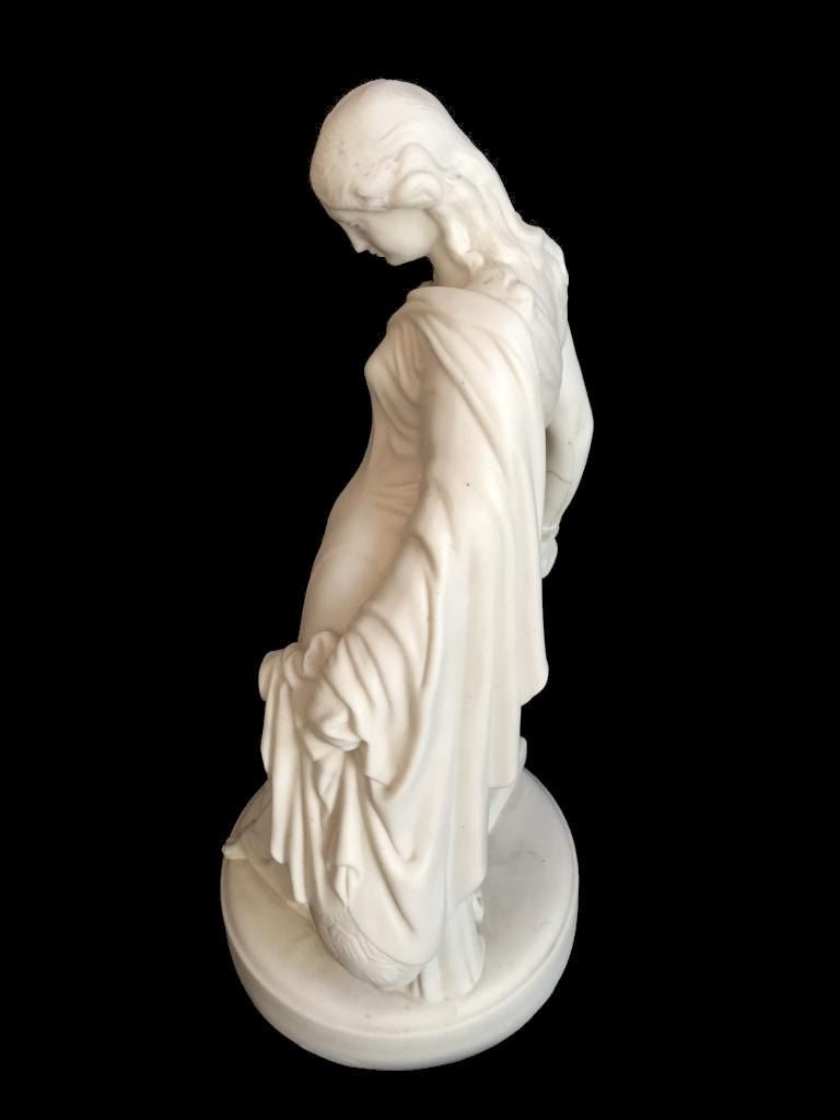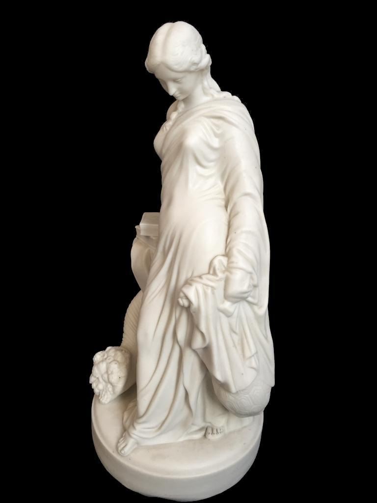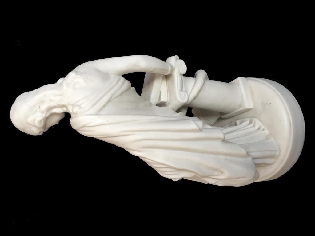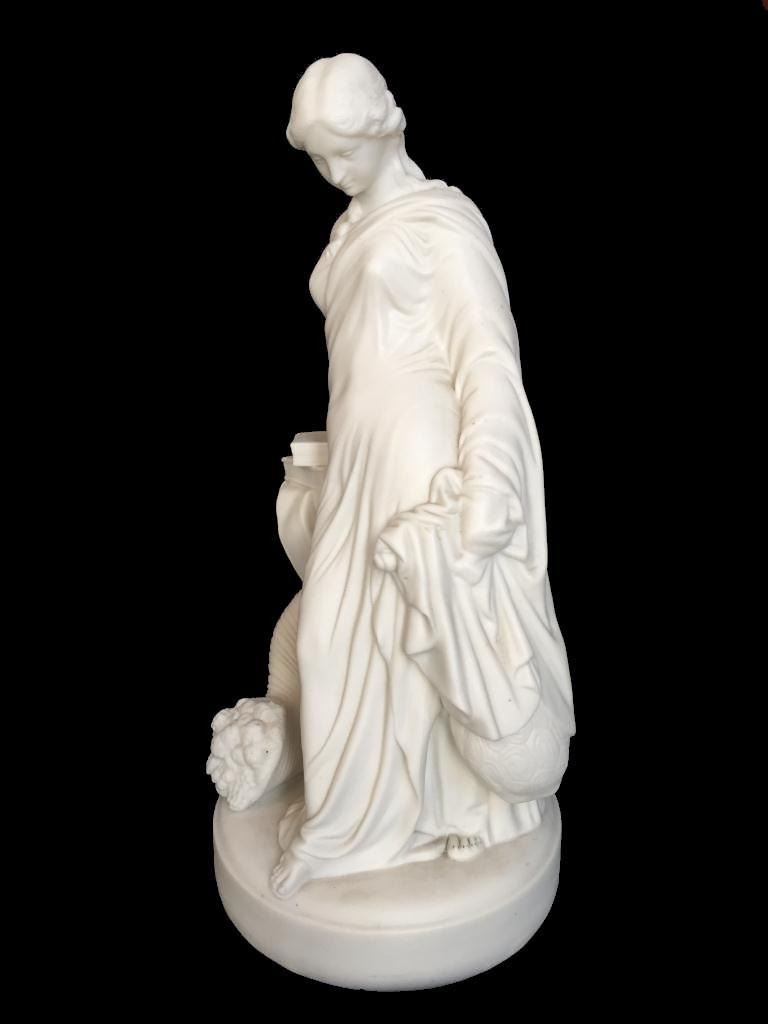 c1850 bisque parian ware figural sculpture of a classical Greek woman leaning against a column, topped with books & entwined by a cornucopia, horn of plenty filled with fruit. 15" H X 7" D. * crack lines visible on theback inside of the statue's arm, as seen in photos.