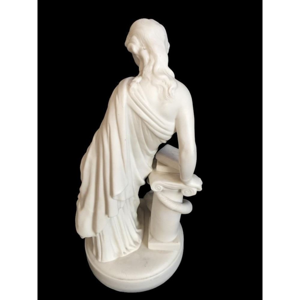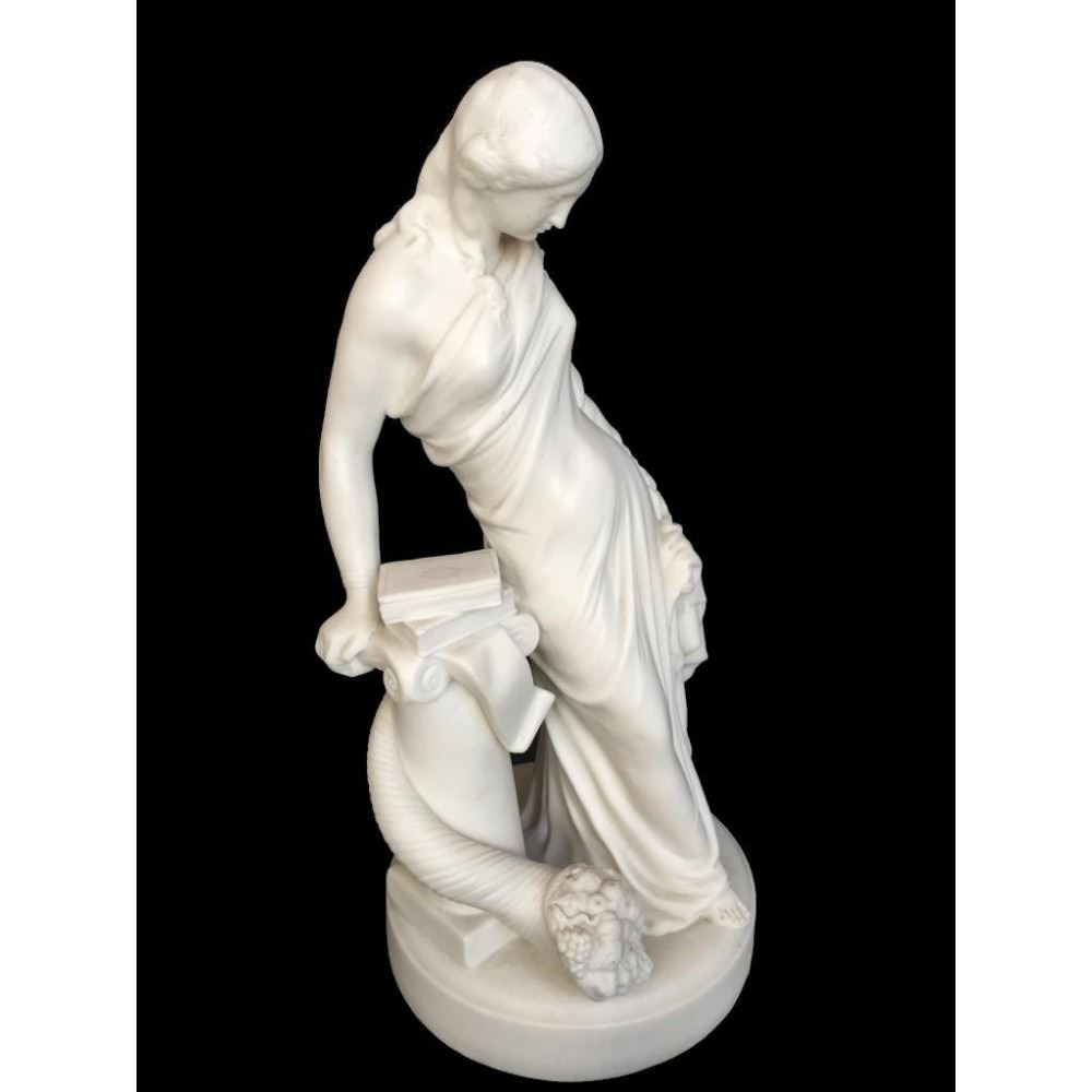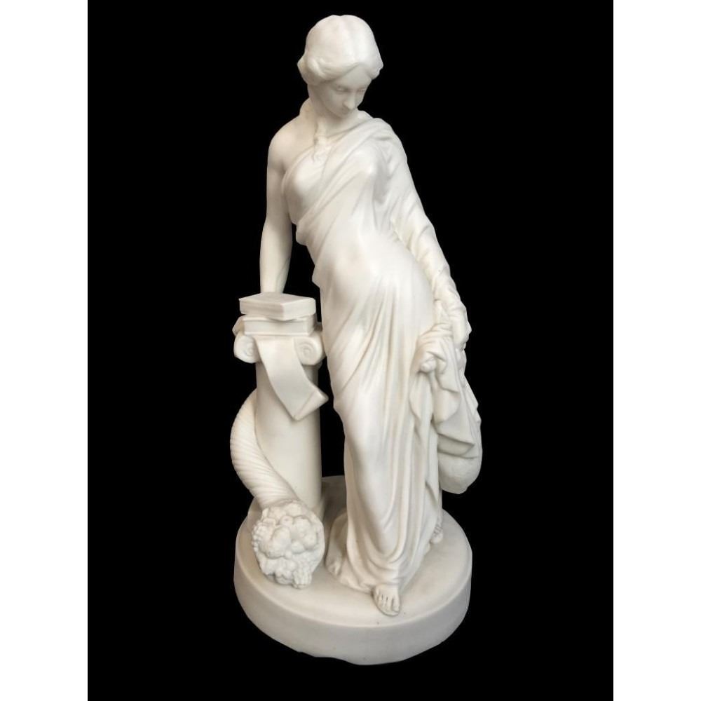 c1850 bisque parian ware figural sculpture of a classical Greek woman leaning against a column, topped with books & entwined by a cornucopia, horn of plenty filled with fruit. 15" H X 7" D. * crack lines visible on theback inside of the statue's arm, as seen in photos.