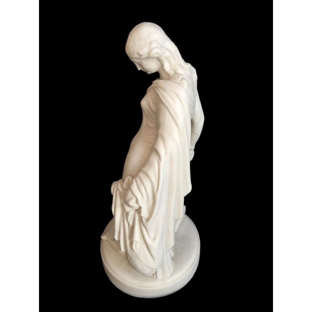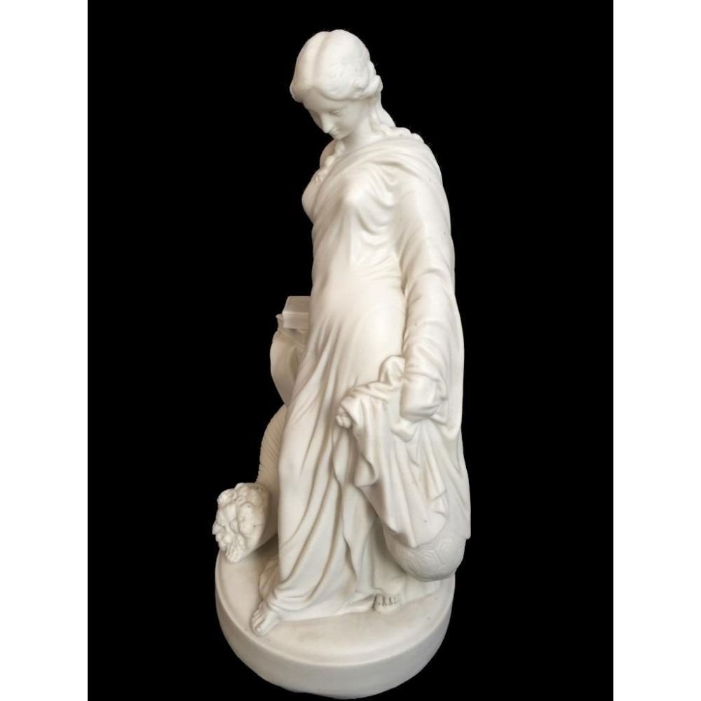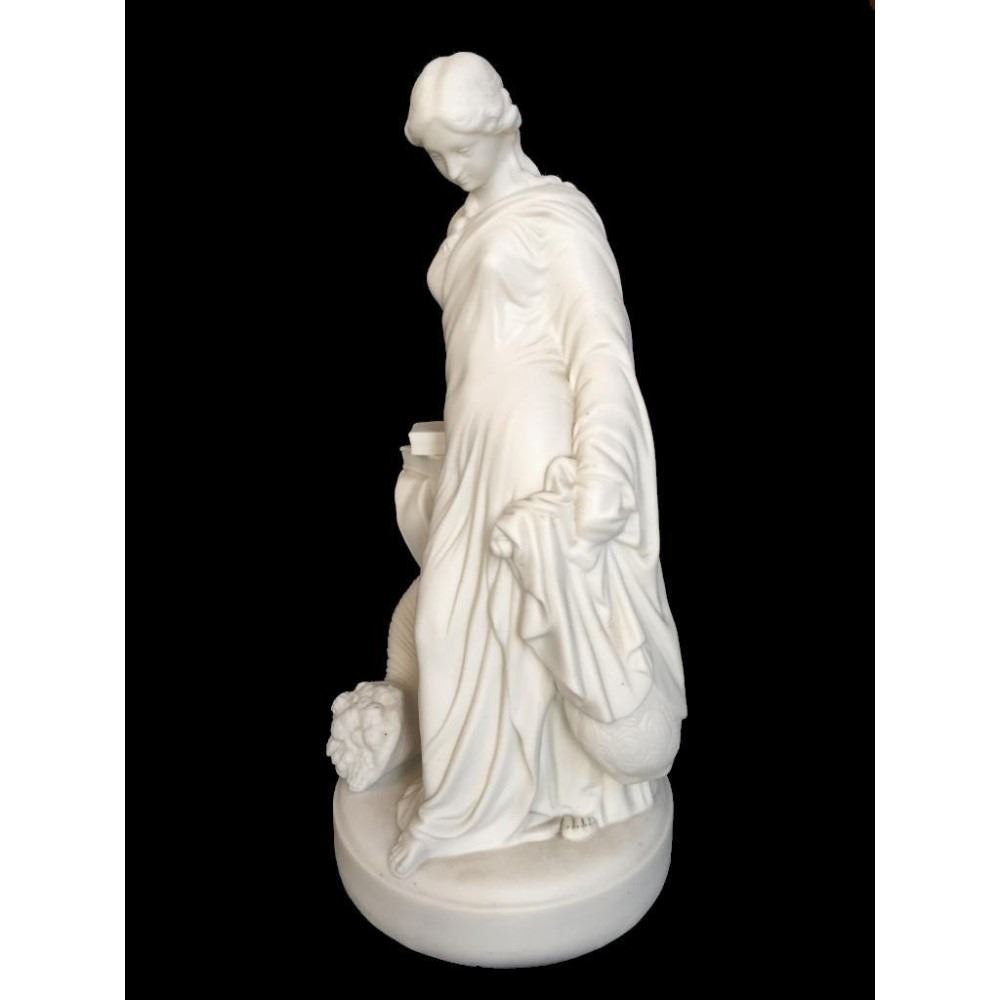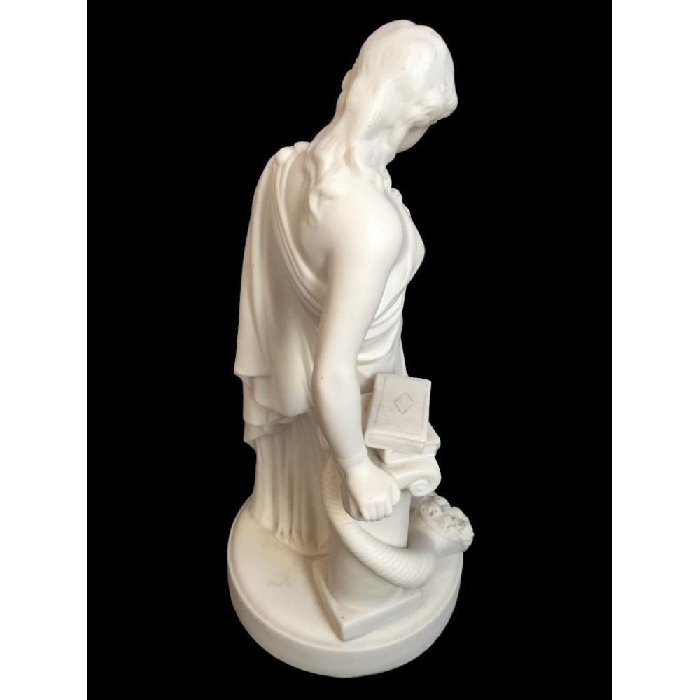 c1850 bisque parian ware figural sculpture of a classical Greek woman leaning against a column, topped with books & entwined by a cornucopia, horn of plenty filled with fruit. 15" H X 7" D. * crack lines visible on theback inside of the statue's arm, as seen in photos.