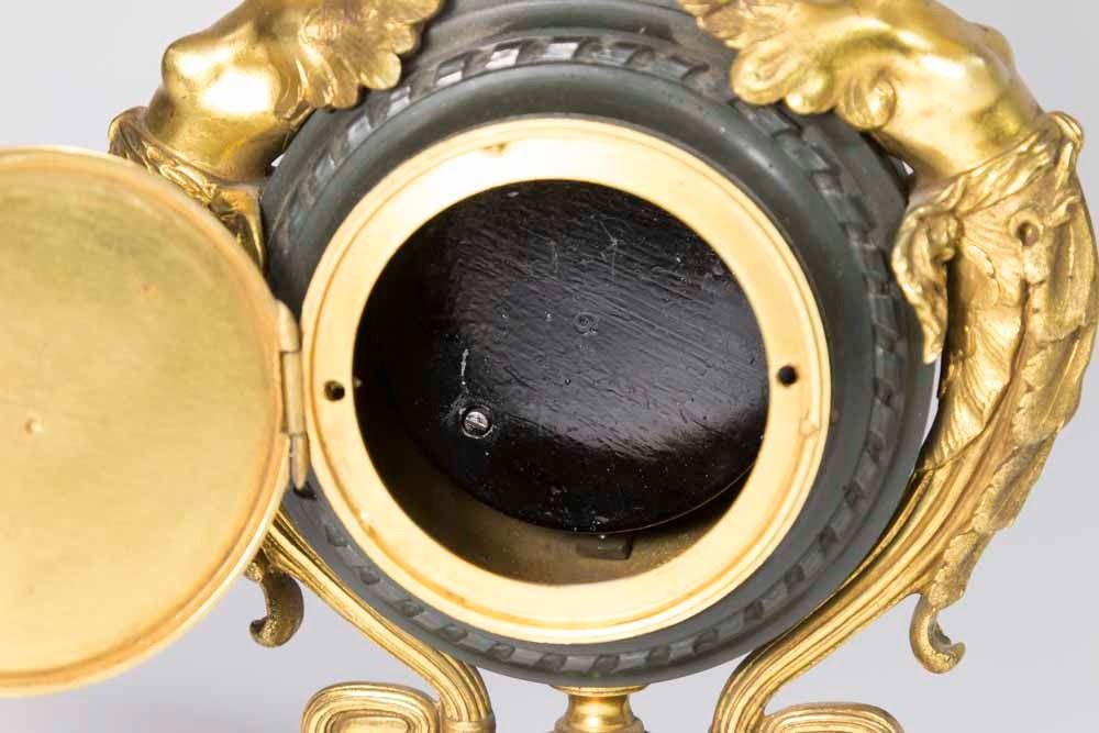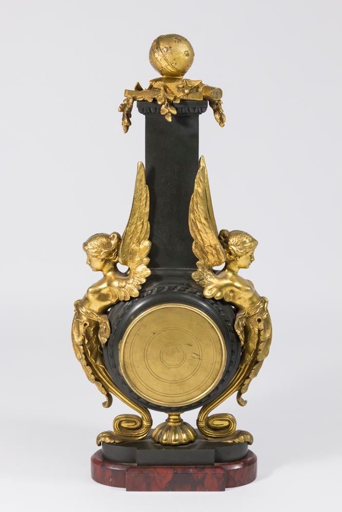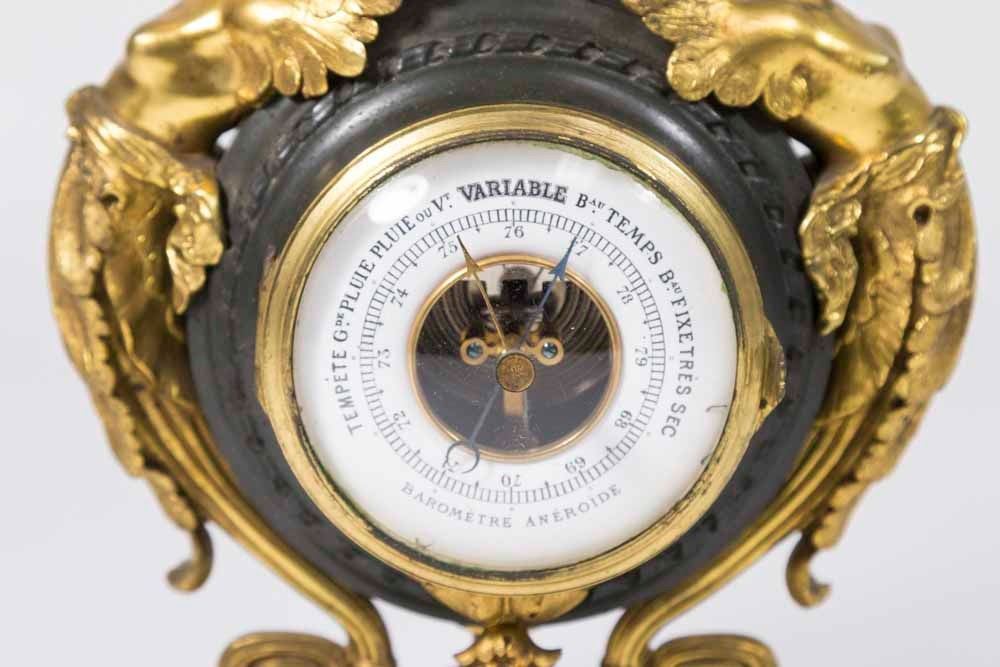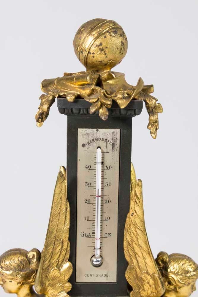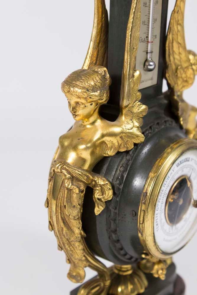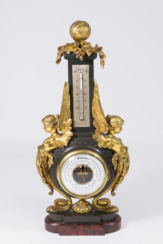 Adorned with dore bronze angel heads; barometer and aneroid (6158). Approx. 13 3/4"H x 6"W.