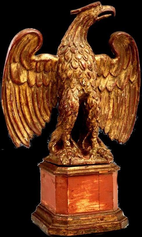 Carved gilt wood table top eagle, 19th c., the spread wing bird on an integral wood octagonal base, H.- 16 1/4 in., W.- 10 1/2 in., D.-6 in. Provenance: The Estate of John Peter Eaves, New Orleans, Louisiana.