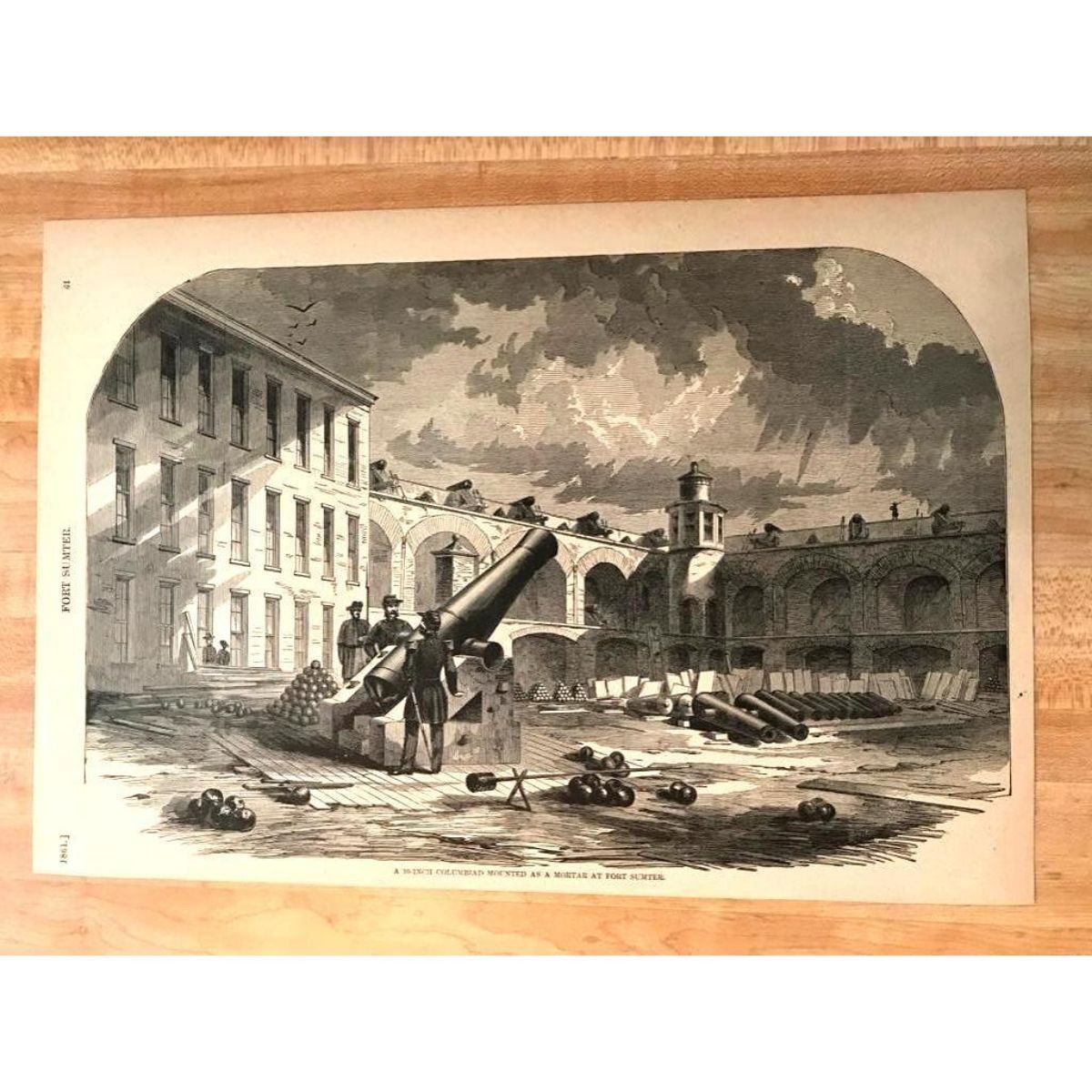 19th Century wood engraving from an 1861 edition of Harper's Pictorial History of The Civil War. A 10-inch Columbiad Mounted As A Mortar At Fort Sumter" interior of the fort with artillery. 10" X 15".