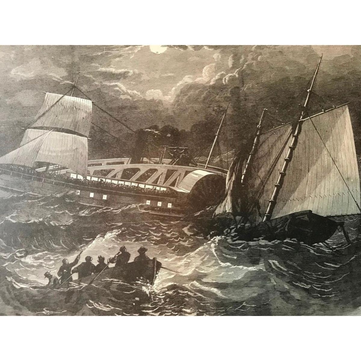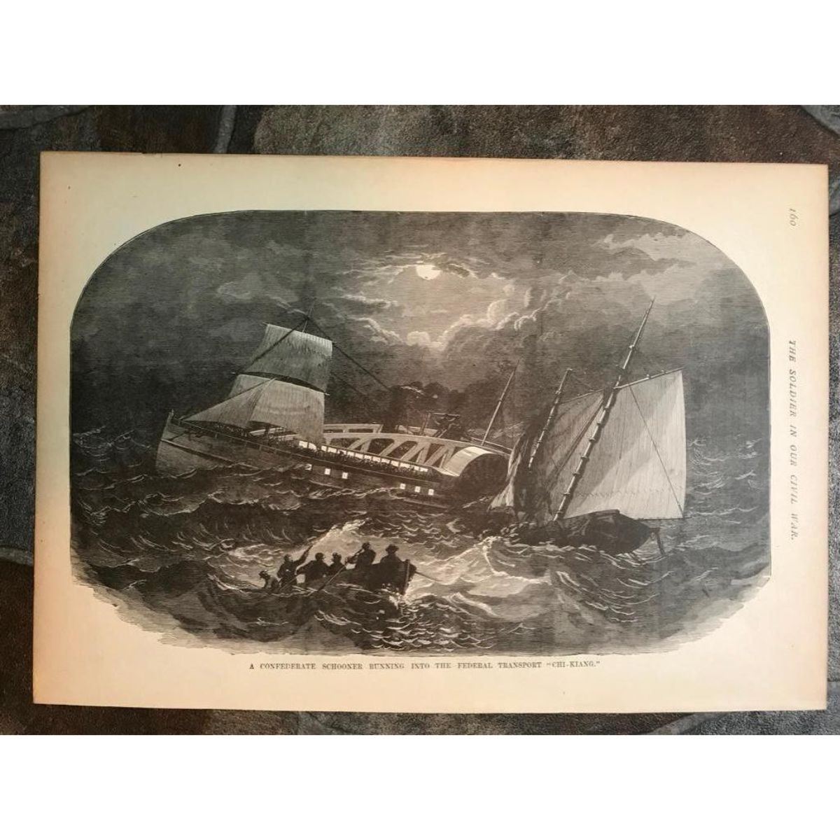 19thc Civil War engraving from "Our Soldier In the Civil War" illustrated book, depicts a Confederate schooner sinking after running into the Federal schooner "Chi-Kiang". 11" x 16" page size.