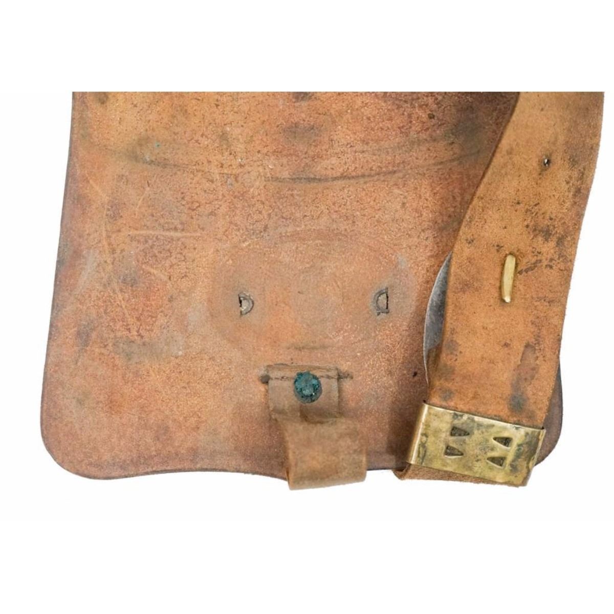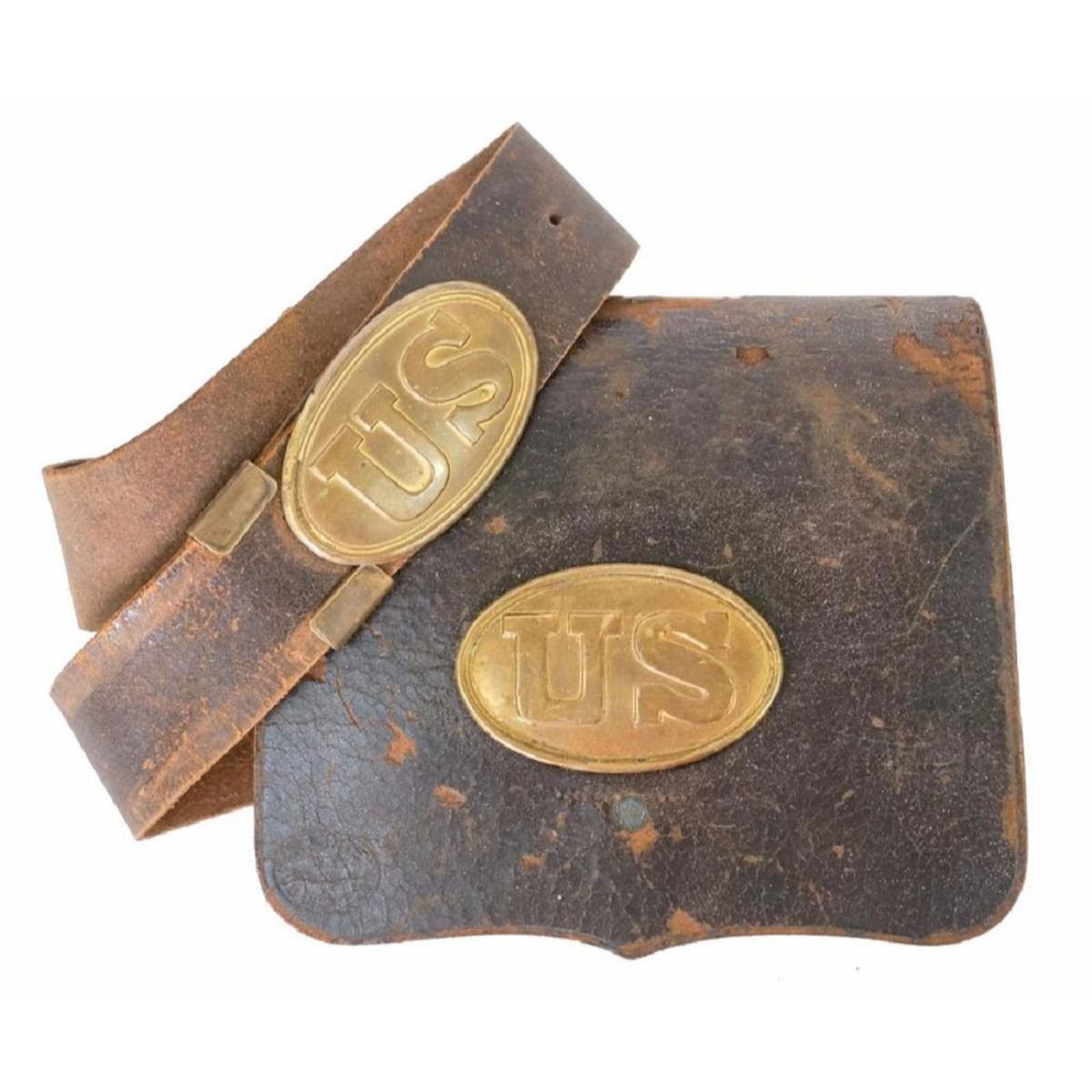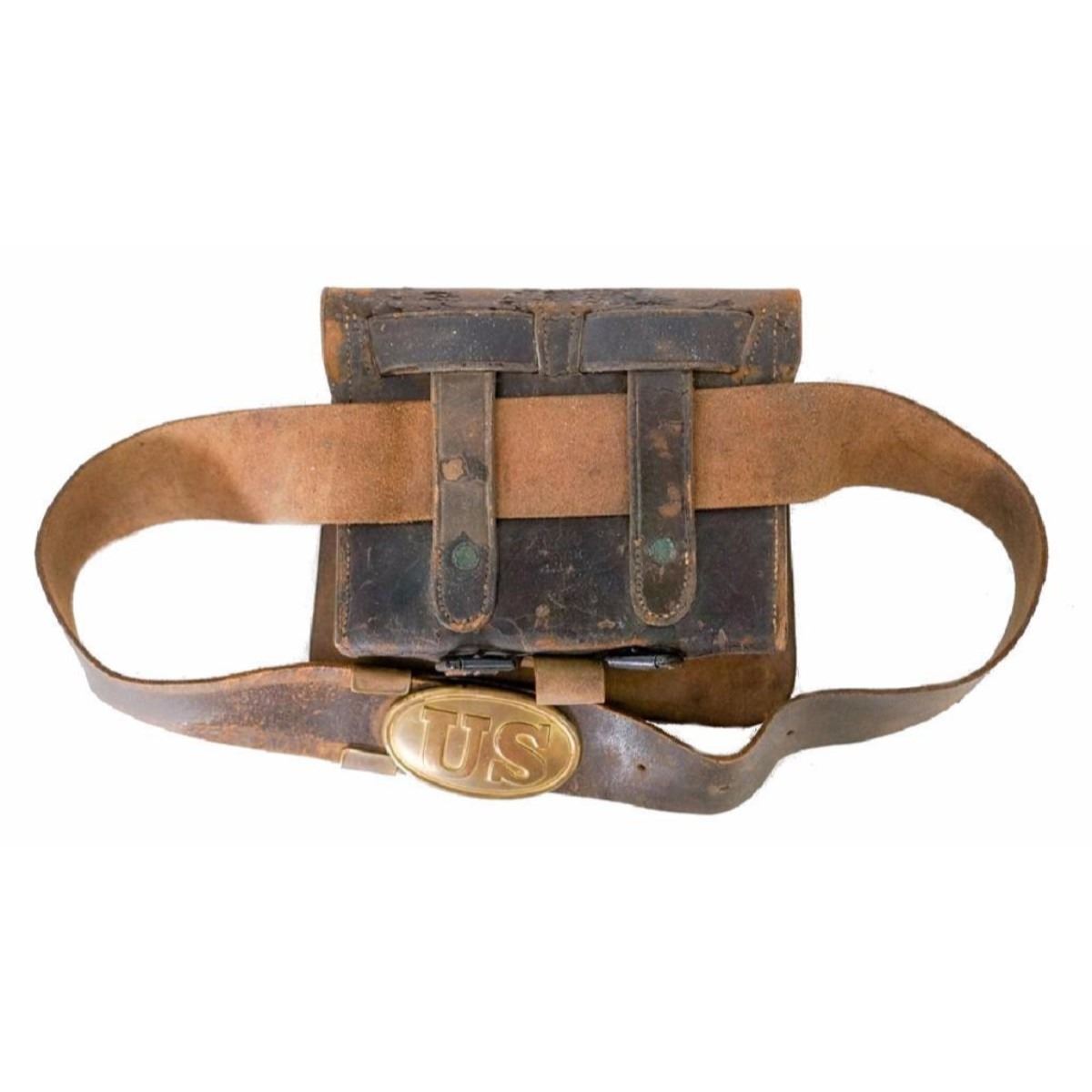 Mid to late 19th century ( Civil War, Indian Wars ) U.S. cartridge box,  black leather with lead-backed brass U.S emblem, with metal boxes on leather belt, with lead-backed U.S. brass buckle, good condition. Some areas of flaking leather. Stamped R. White, U.S. Ord. Dept. Sub Inspector, Newark, N.J. Provenance: Estate of Earl E. Buchanan, Gunsmith, Kooskia, ID.
