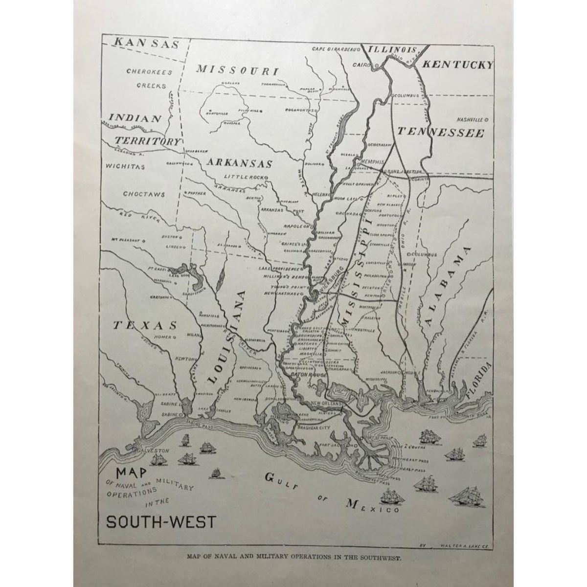 19th Century Civil War era map, page 356 from "The Civil War In the United States". Map of Naval and Military Operations In The Southwest. 10 3/4" X 15 1/2".Â