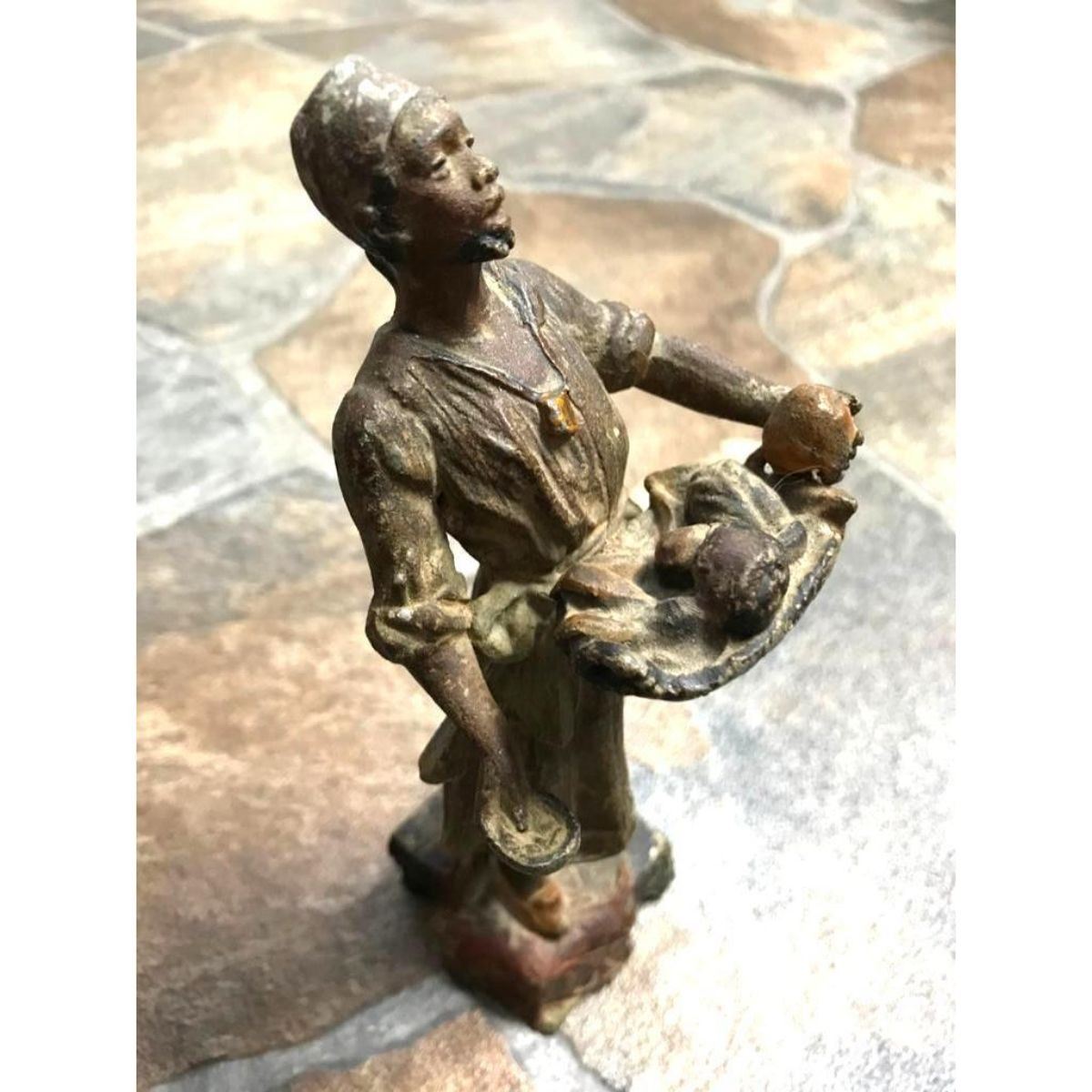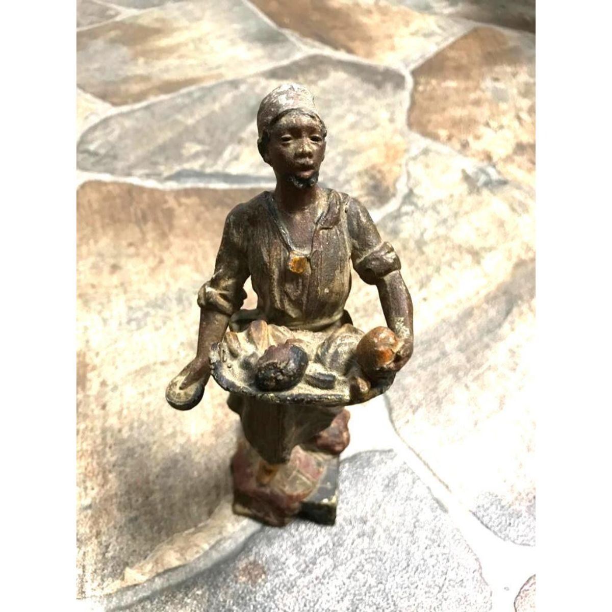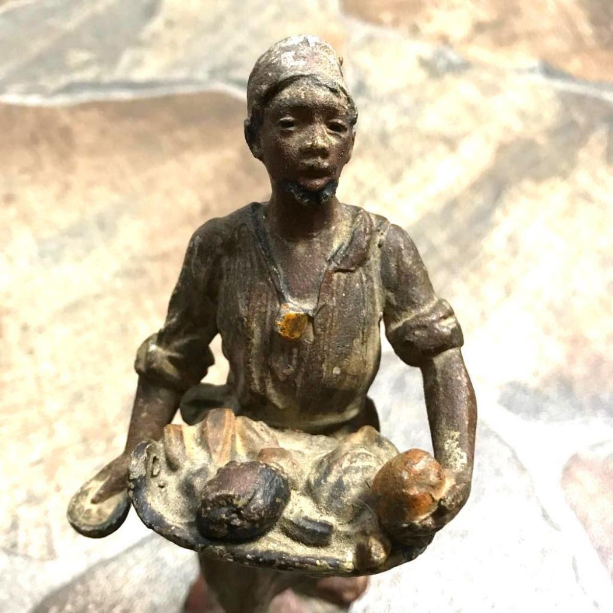 c.1890's cold-painted spelter Orientalist Arab figural statue, a man holding a woven basket of fruit. In the style of  Franz Bergman but unmarked, the statue has wonderful facial features & detailing, with traces of color throughout & traces of gilt underneath. 7" H X 2" W X 2" D. * a small crack to the bottom back of the skirt, as seen in photos.