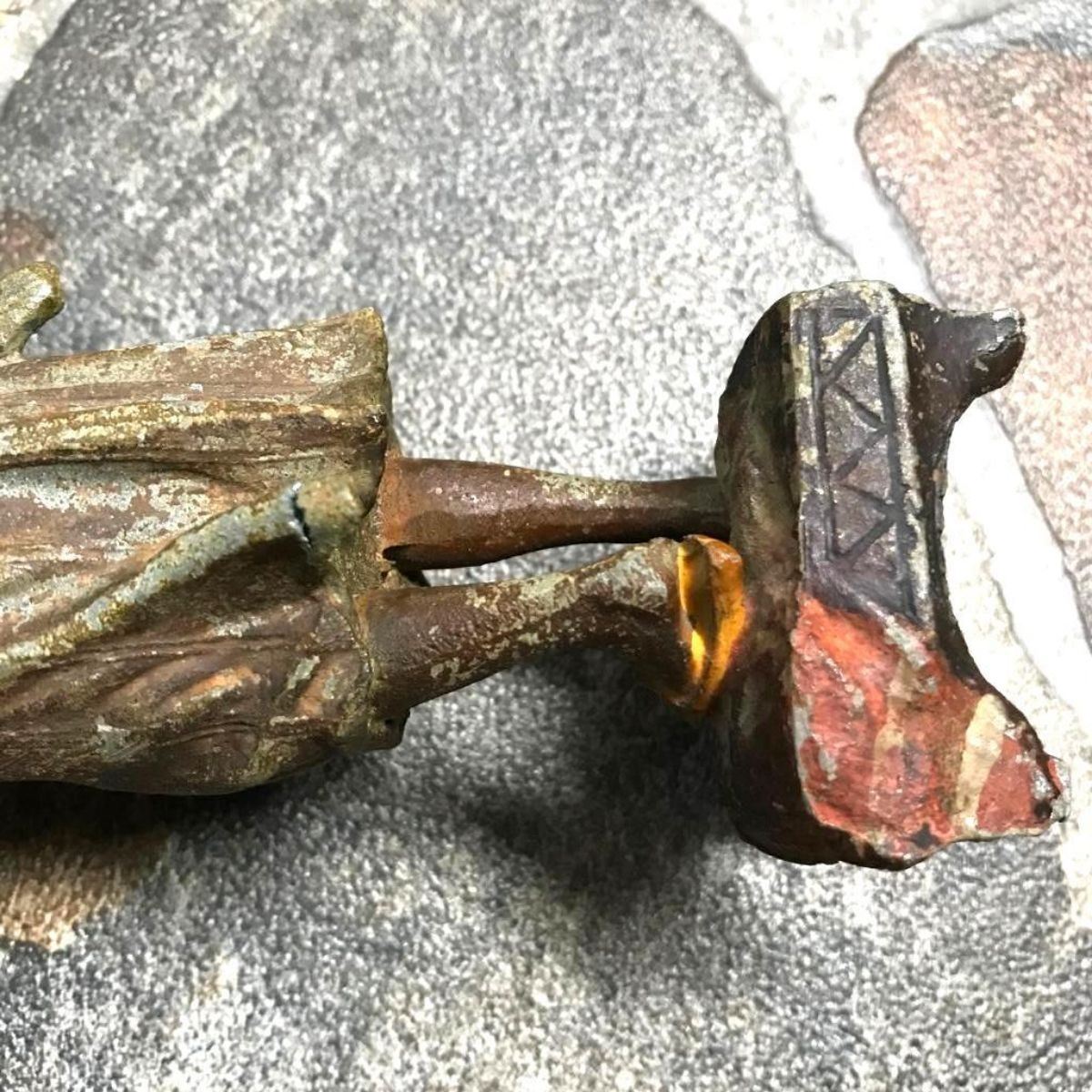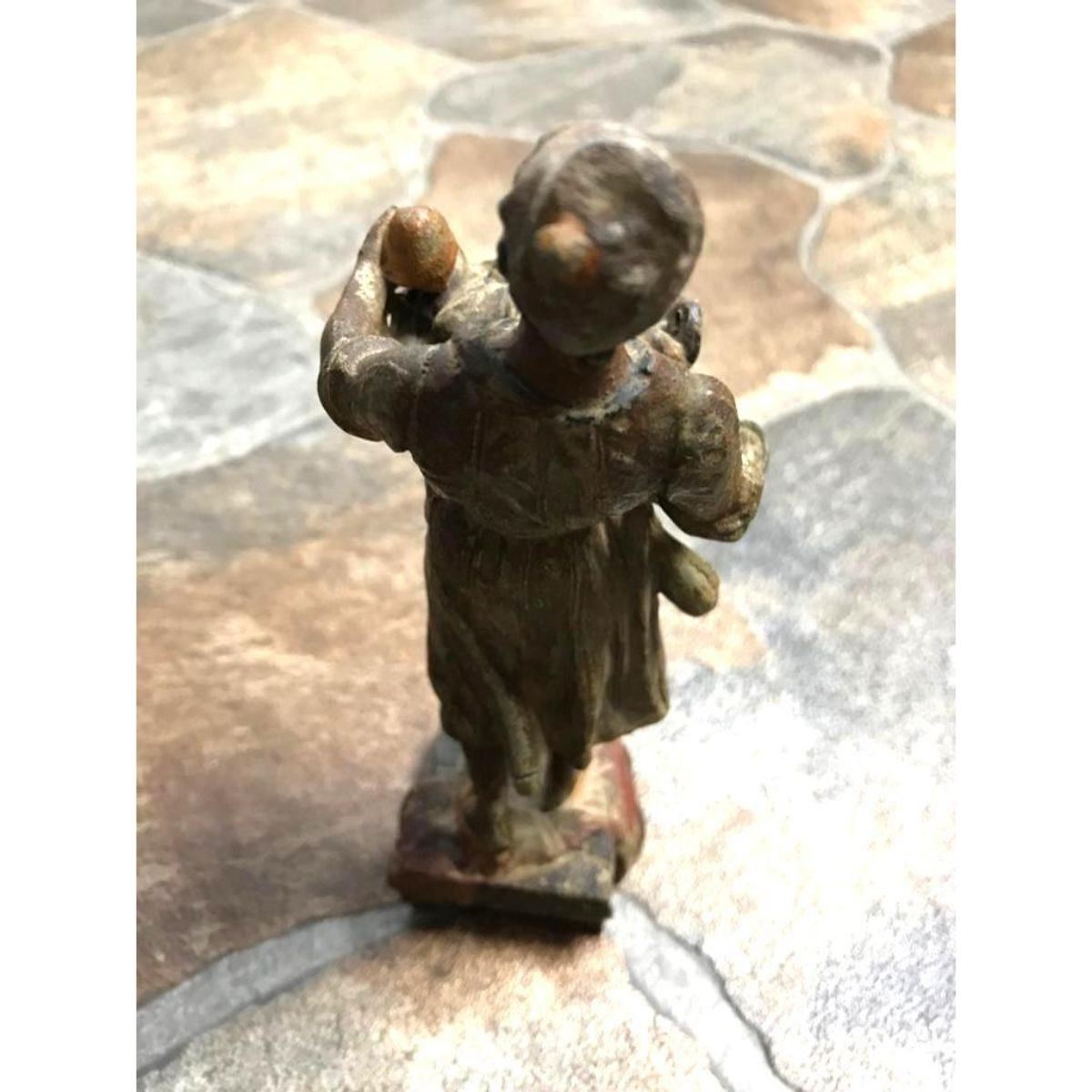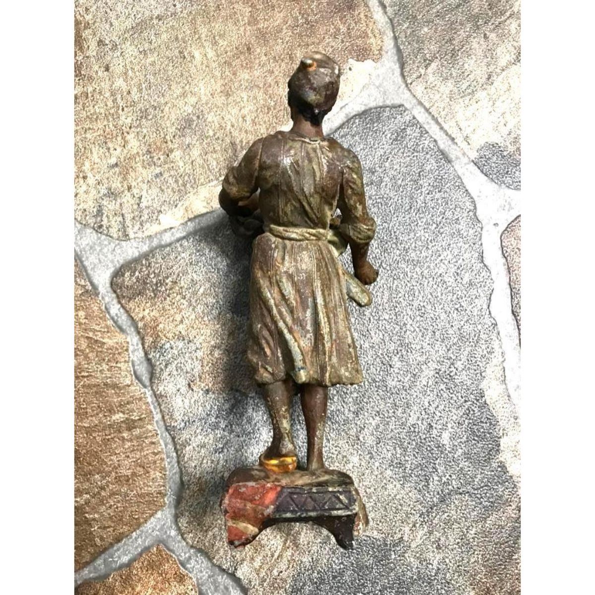 c.1890's cold-painted spelter Orientalist Arab figural statue, a man holding a woven basket of fruit. In the style of  Franz Bergman but unmarked, the statue has wonderful facial features & detailing, with traces of color throughout & traces of gilt underneath. 7" H X 2" W X 2" D. * a small crack to the bottom back of the skirt, as seen in photos.
