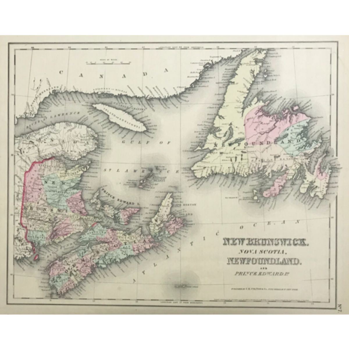 1857 Colton Map of New Brunswick, Nova Scotia, Newfoundland & Prince Edward Island. Antique geographical map. From the famous "Colton's General atlas" by Colton ( NYC J.H. Colton And Company, No. 172 William Street ). Edition of 1857, but previous copyright of 1855. This atlas revolutionized the genre, & its maps are extremely valuable testimonials to the history of the Construction of the United States, at a time when the country begins to take a definitive form. This maps has the rare characteristic of being devoid of the famous decorative borders typical of Colton. 13" H X 17" W.