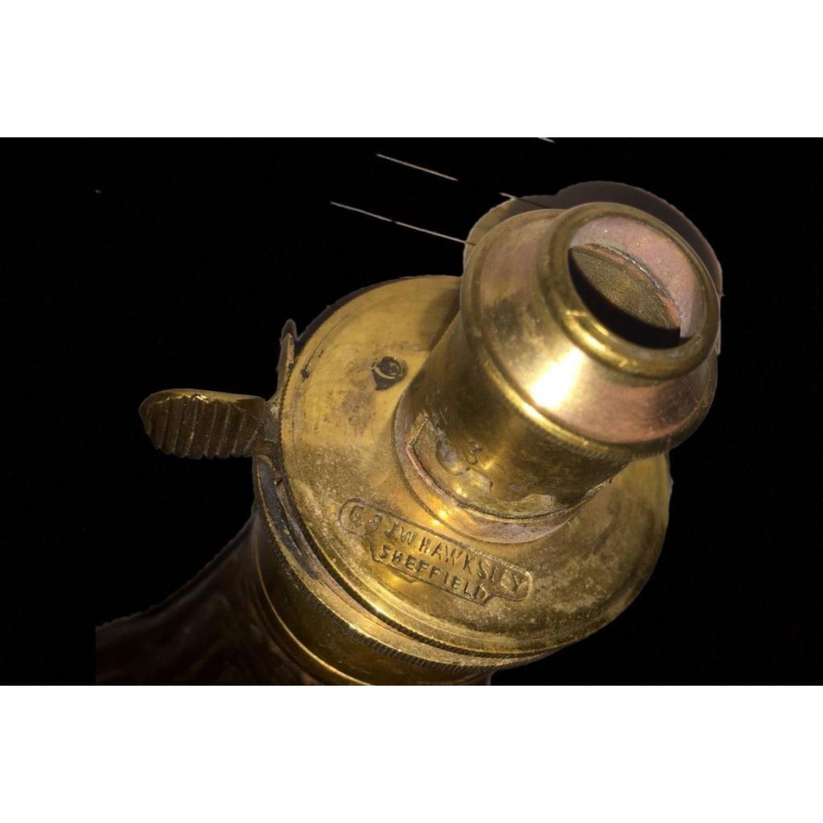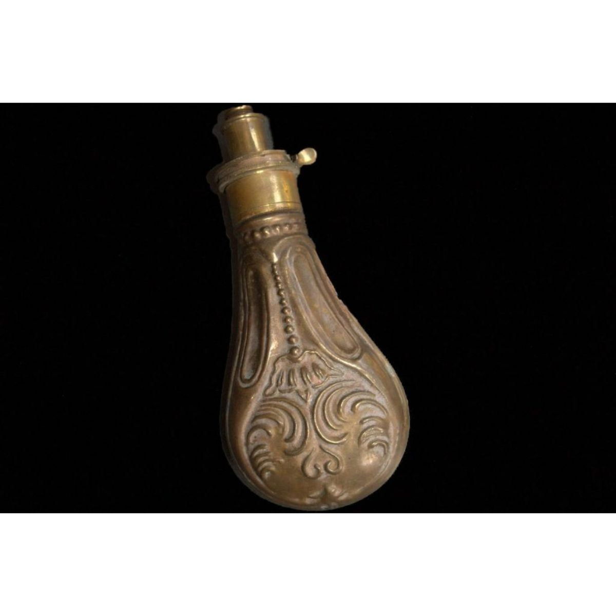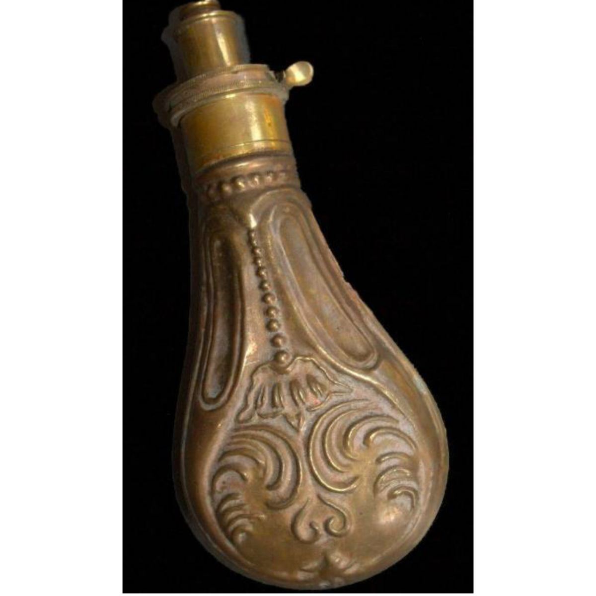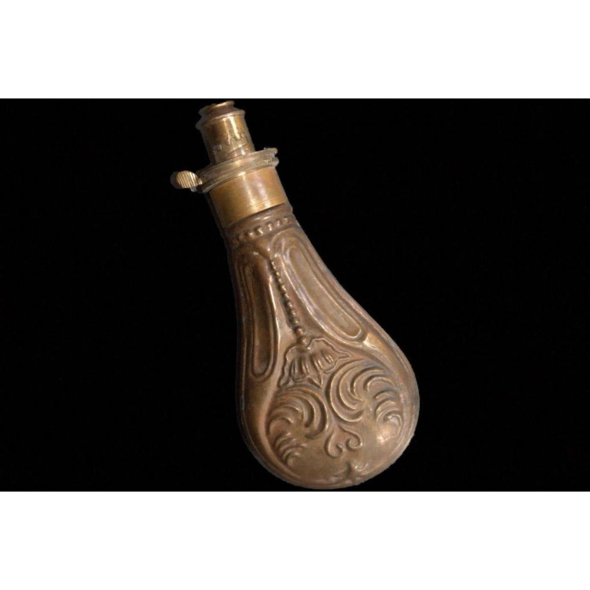 Antique Copper & Brass Black Gun Powder flask G & J.W Hawksley Floral Relief. Beautiful powder flask, made by G & J.W Hawksley from Sheffield, England. All original parts are there. Flask has the makers mark. The nipple reads DRAMS and is graduated; the lever moves left and right. 7.5" long. Good condition.